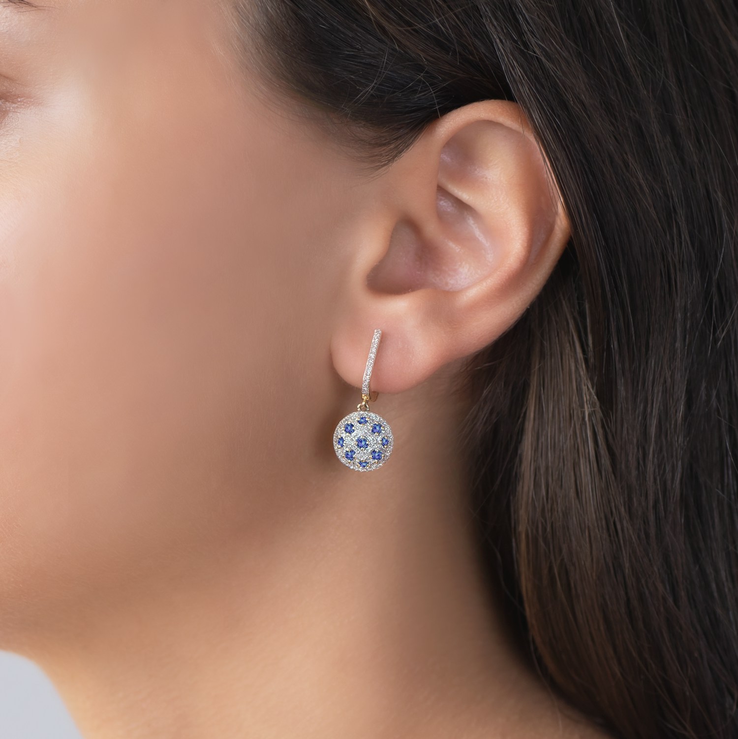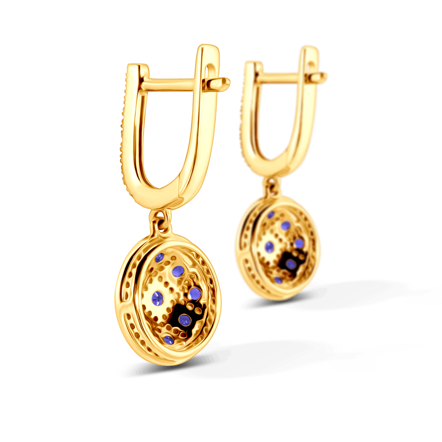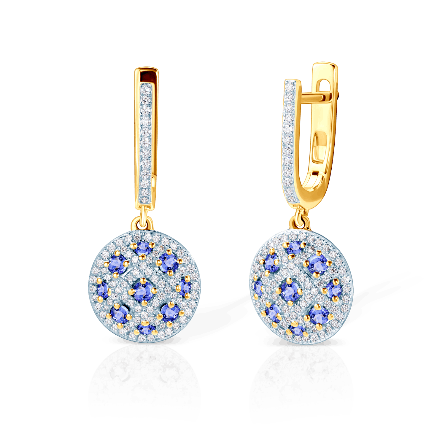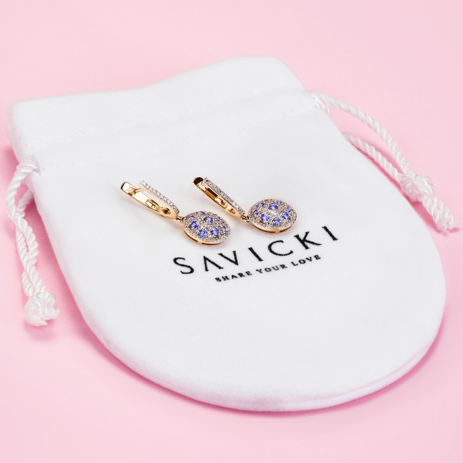 Kolczyki Savicki wykonane z połączenia 14-karatowego żółtego i białego złota (próba 585). W kolczykach osadzonych zostało 18 tanzanitów o łącznej masie 0,50 ct oraz 172 diamenty o łącznej masie 0,36 ct, szlifie brylantowym i czystości SI2/H.