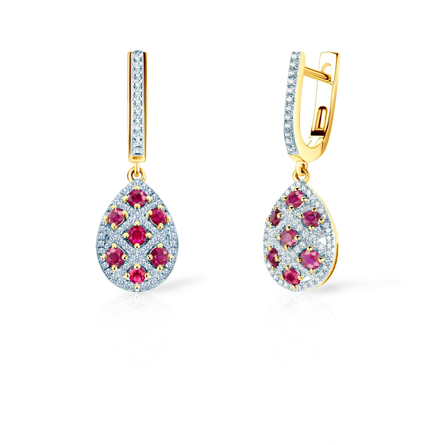 Kolczyki wykonane z połączenia żółtego i białego złota (próba 585). W kolczykach osadzonych zostało 14 rubinów o łącznej masie 0,48 ct oraz 164 diamenty o łącznej masie 0,35 ct, szlifie brylantowym i czystości SI2/H.