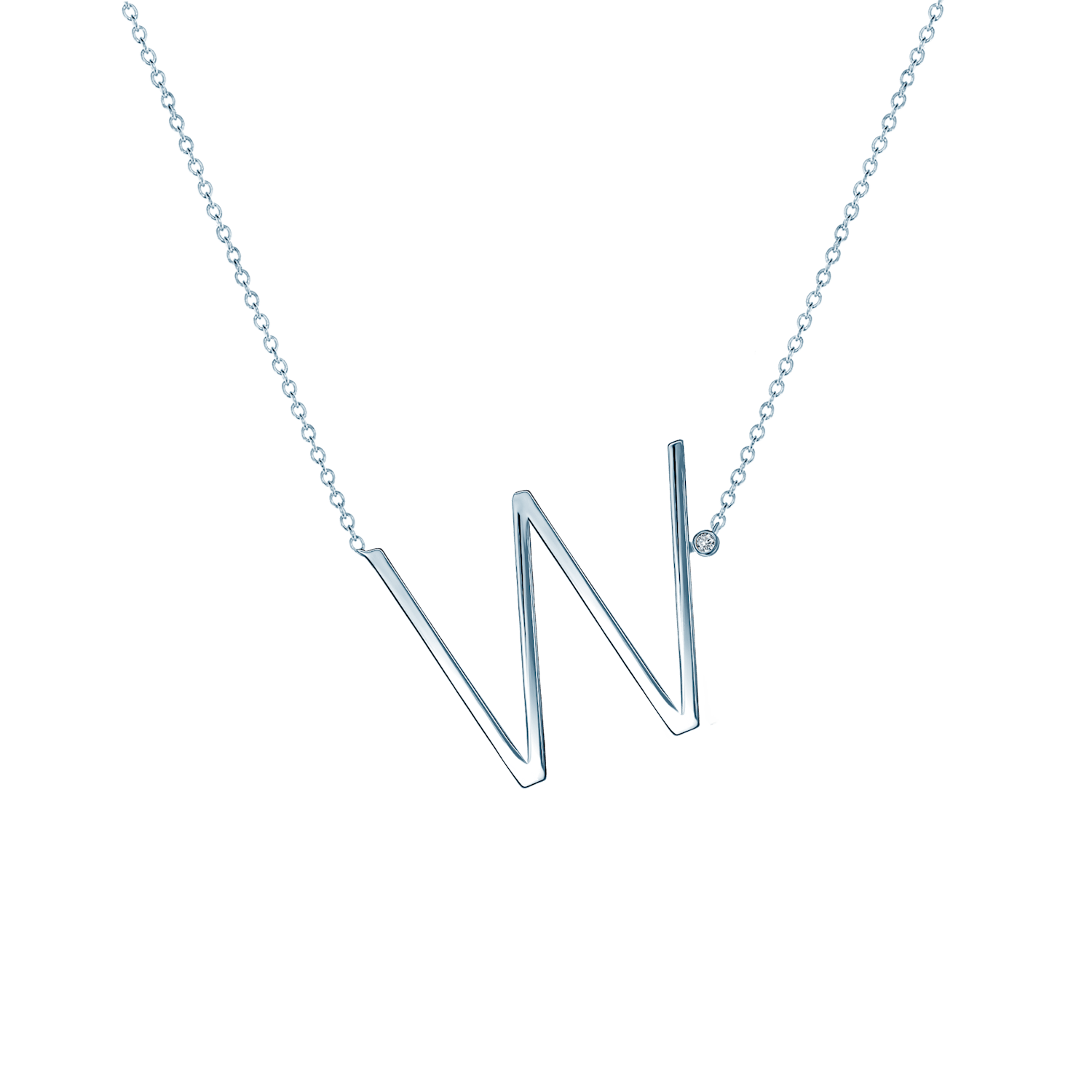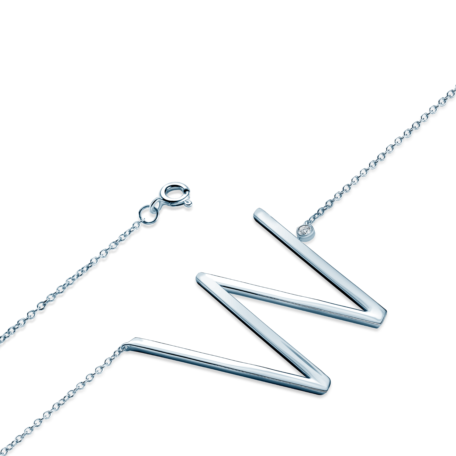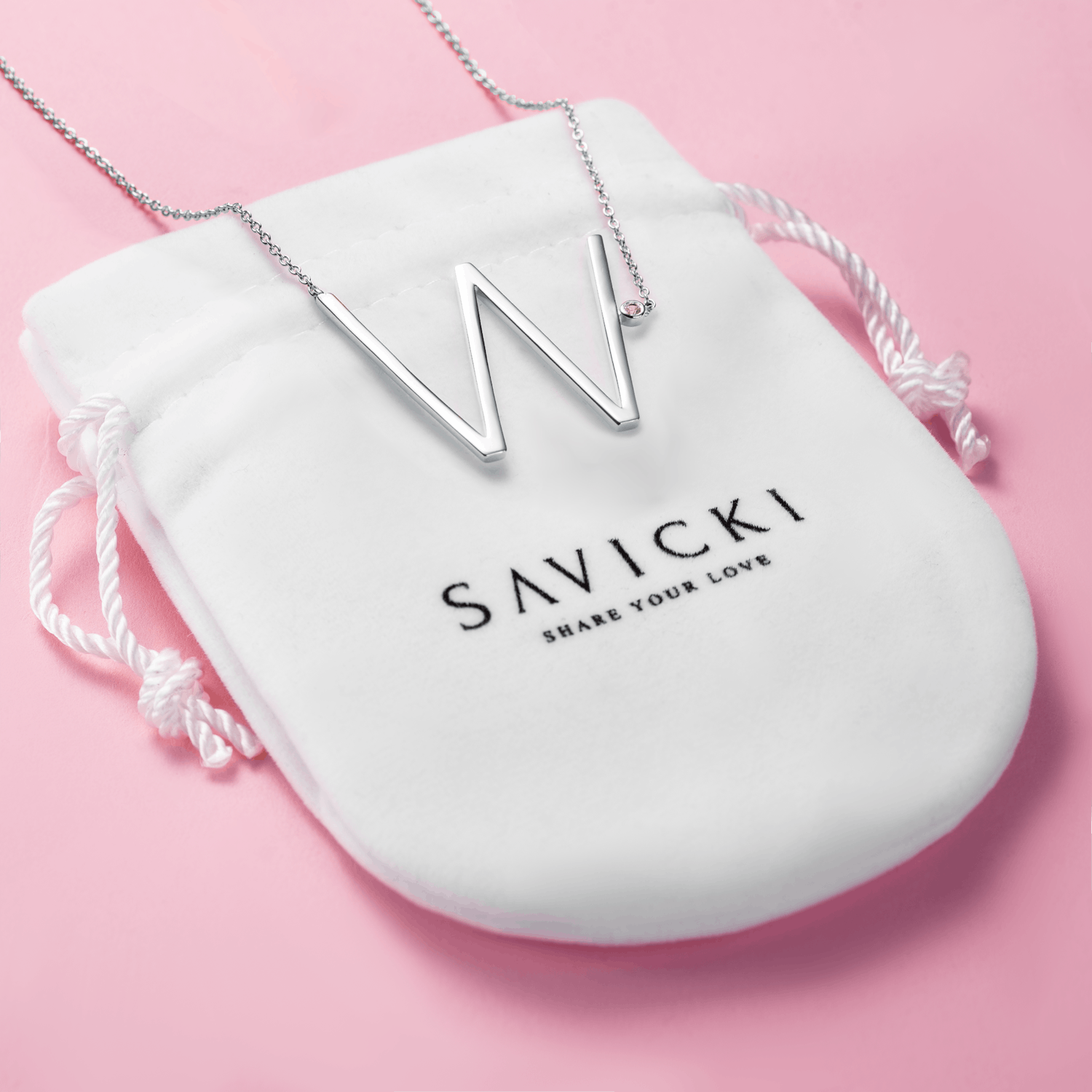 Naszyjnik celebrytka litera "W" Savicki wykonany ze srebra (próba 925). W naszyjniku osadzony został biały szafir o masie 0,05 ct i szlifie brylantowym.