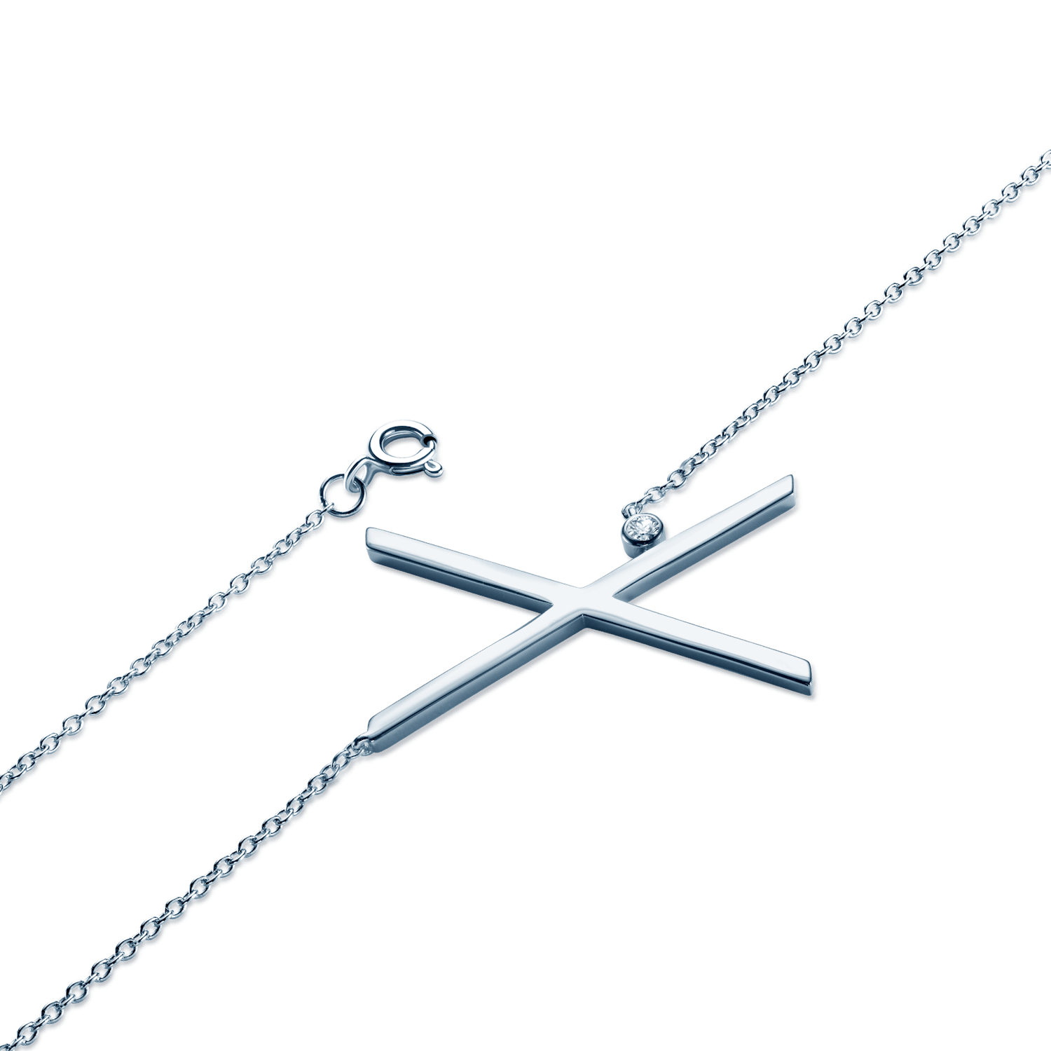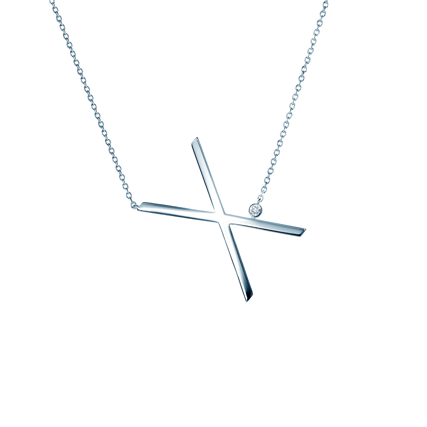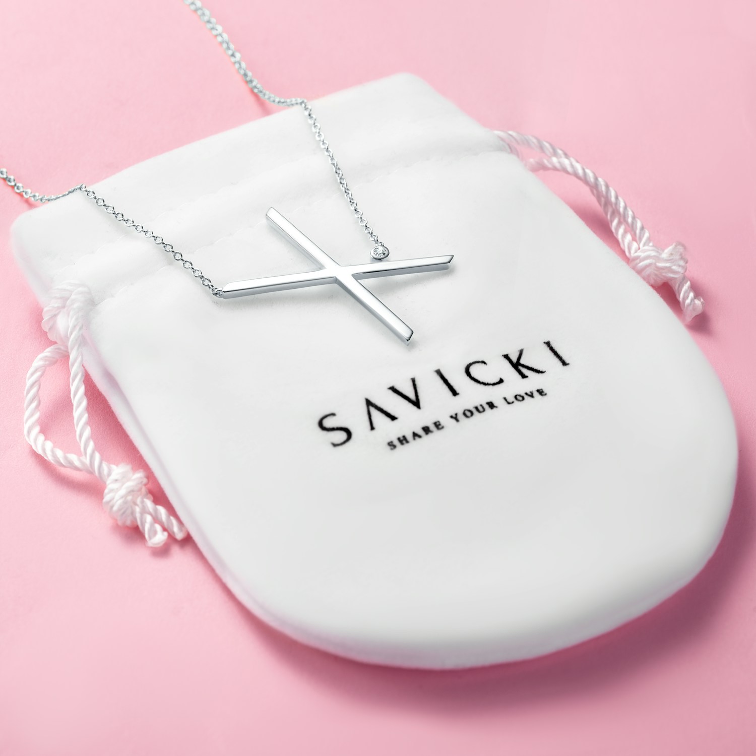Naszyjnik celebrytka litera "X" Savicki wykonany ze srebra (próba 925). W naszyjniku osadzony został biały szafir o masie 0,04 ct i szlifie brylantowym.