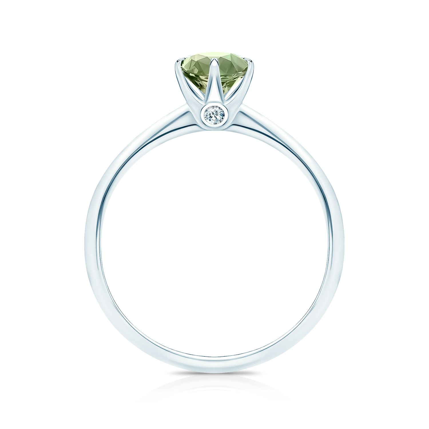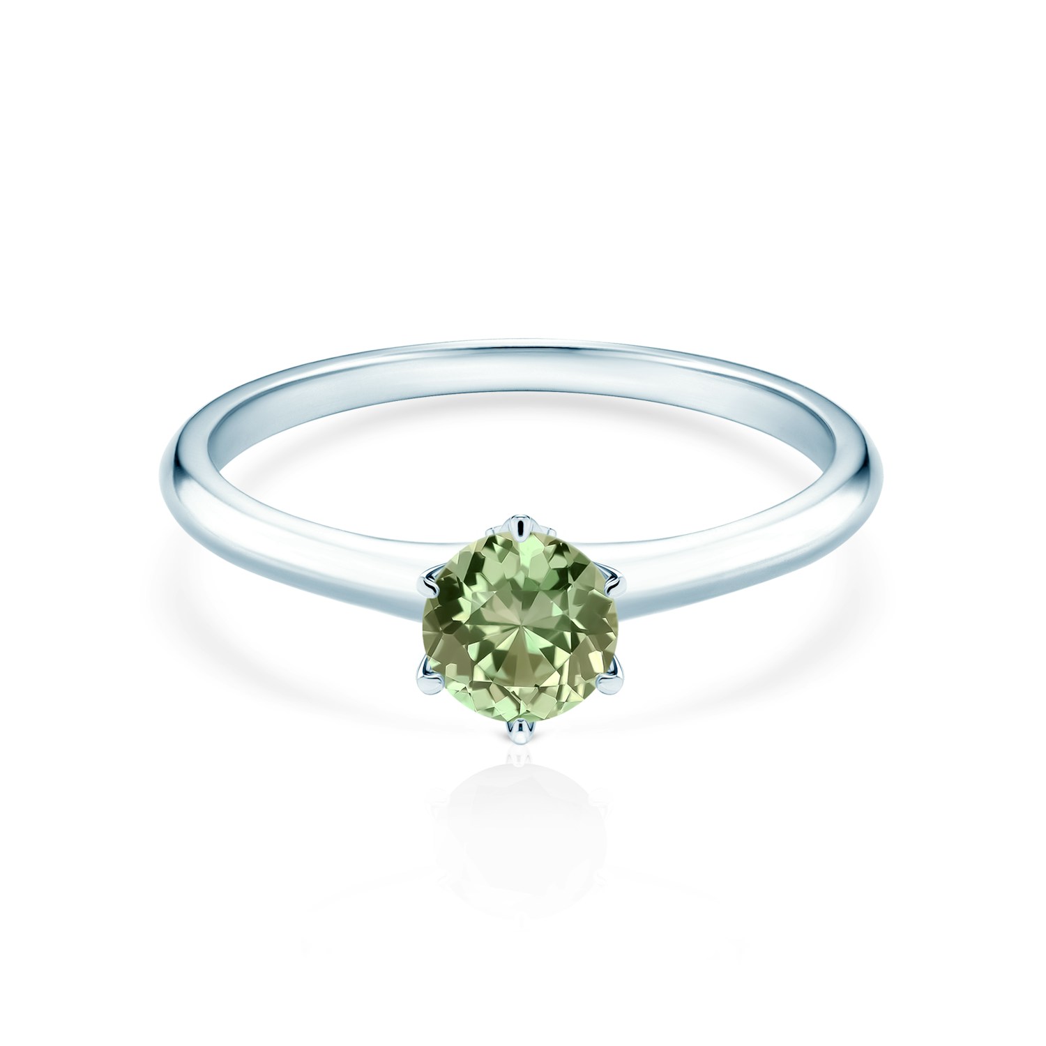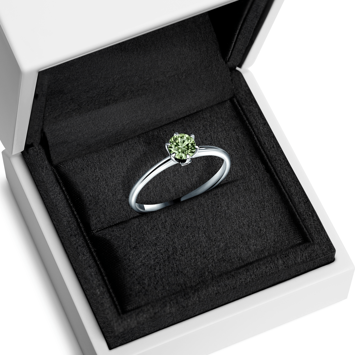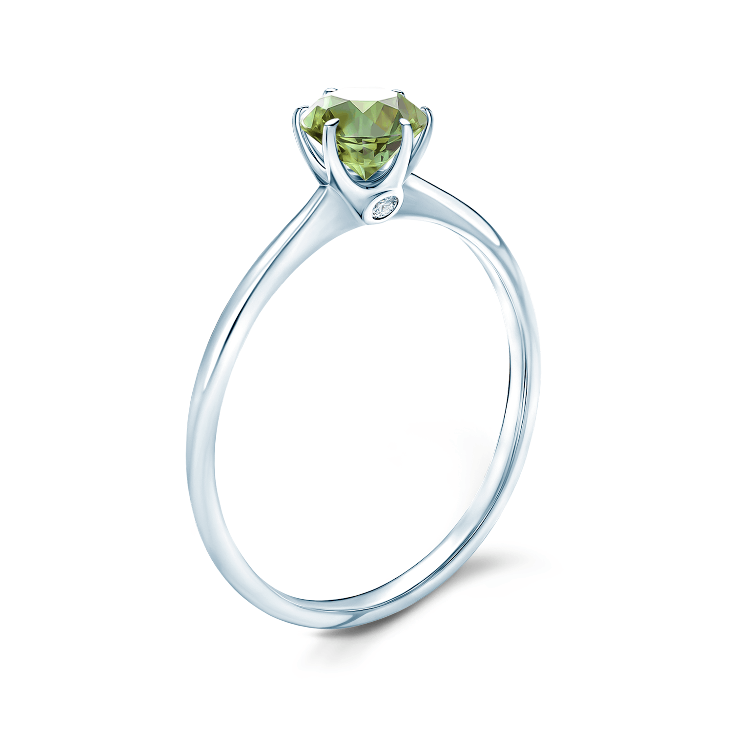 Pierścionek zaręczynowy z centralnie umieszczonym zielonym szafirem o masie 0,30 ct oraz dwoma diamentami o łącznej masie 0,03 ct, wysokiej czystości SI/H, o szlifie brylantowym. Wykonany z 14-karatowego białego złota (próba 0,585).