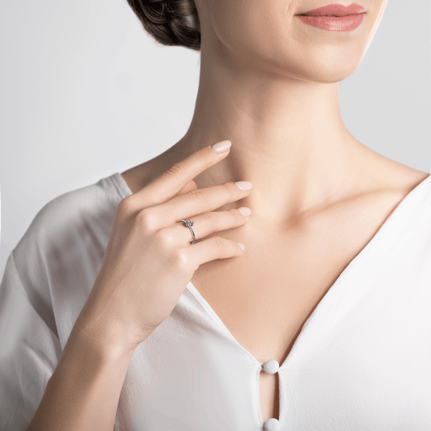 Specjalnie wyprofilowana obrączka idealnie wpasowuje się w pierścionek zaręczynowy, tworząc jedyną taką kompozycję biżuterii.