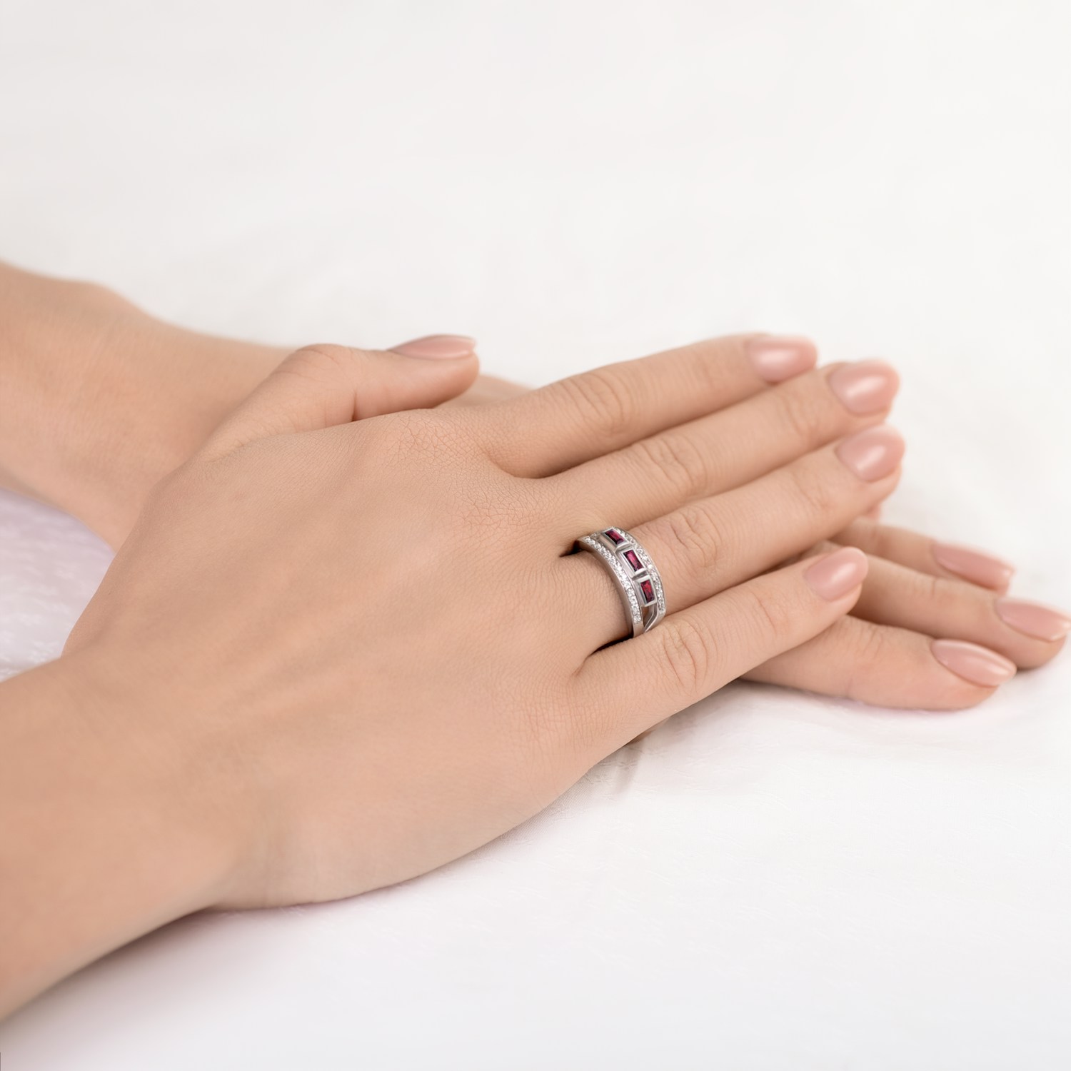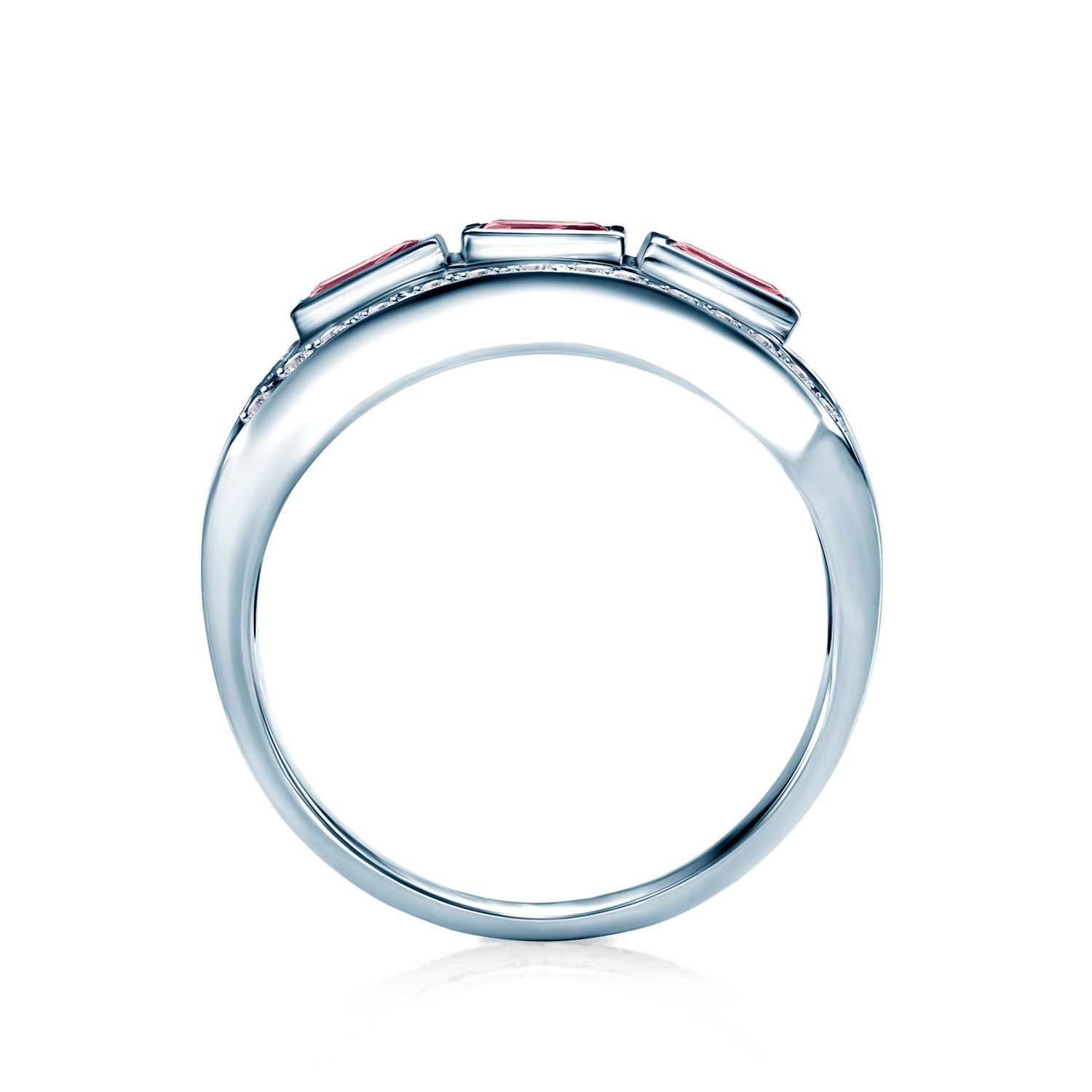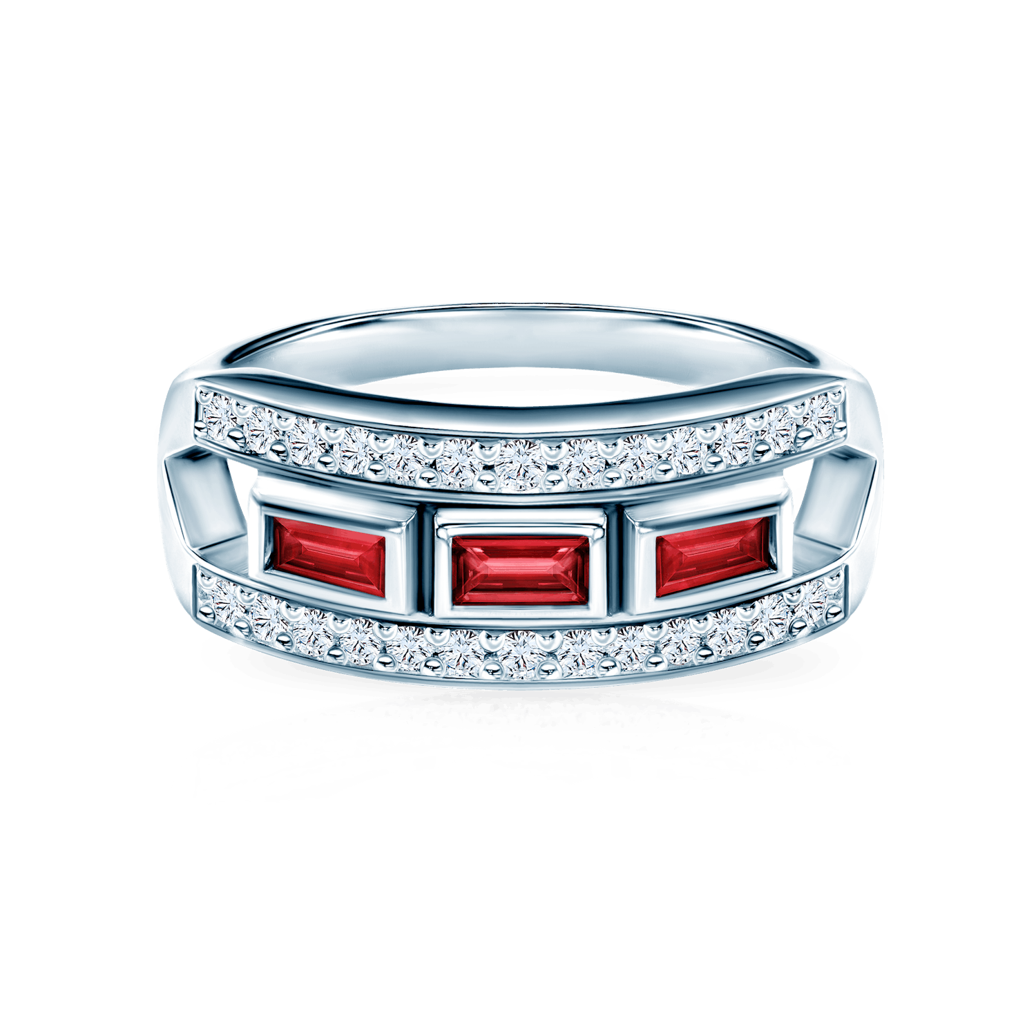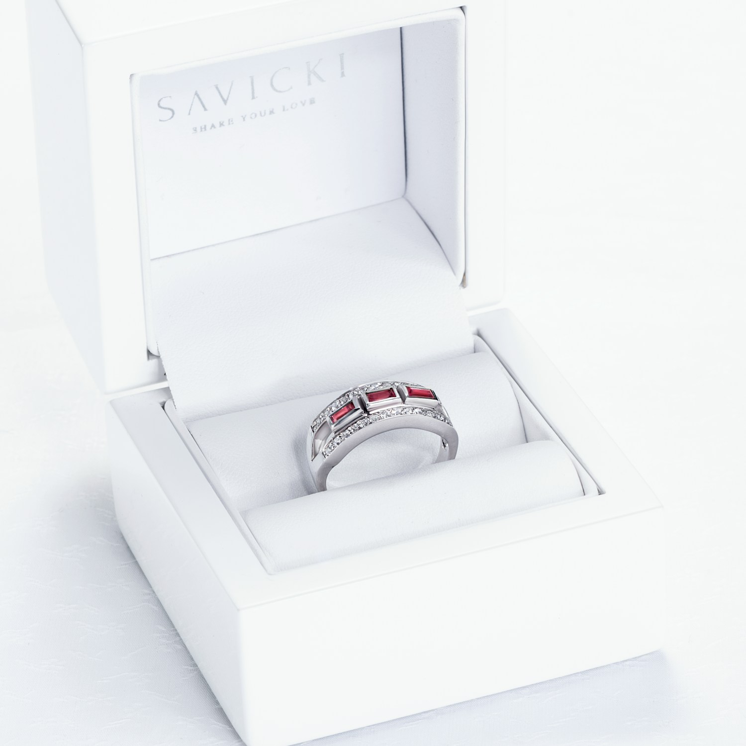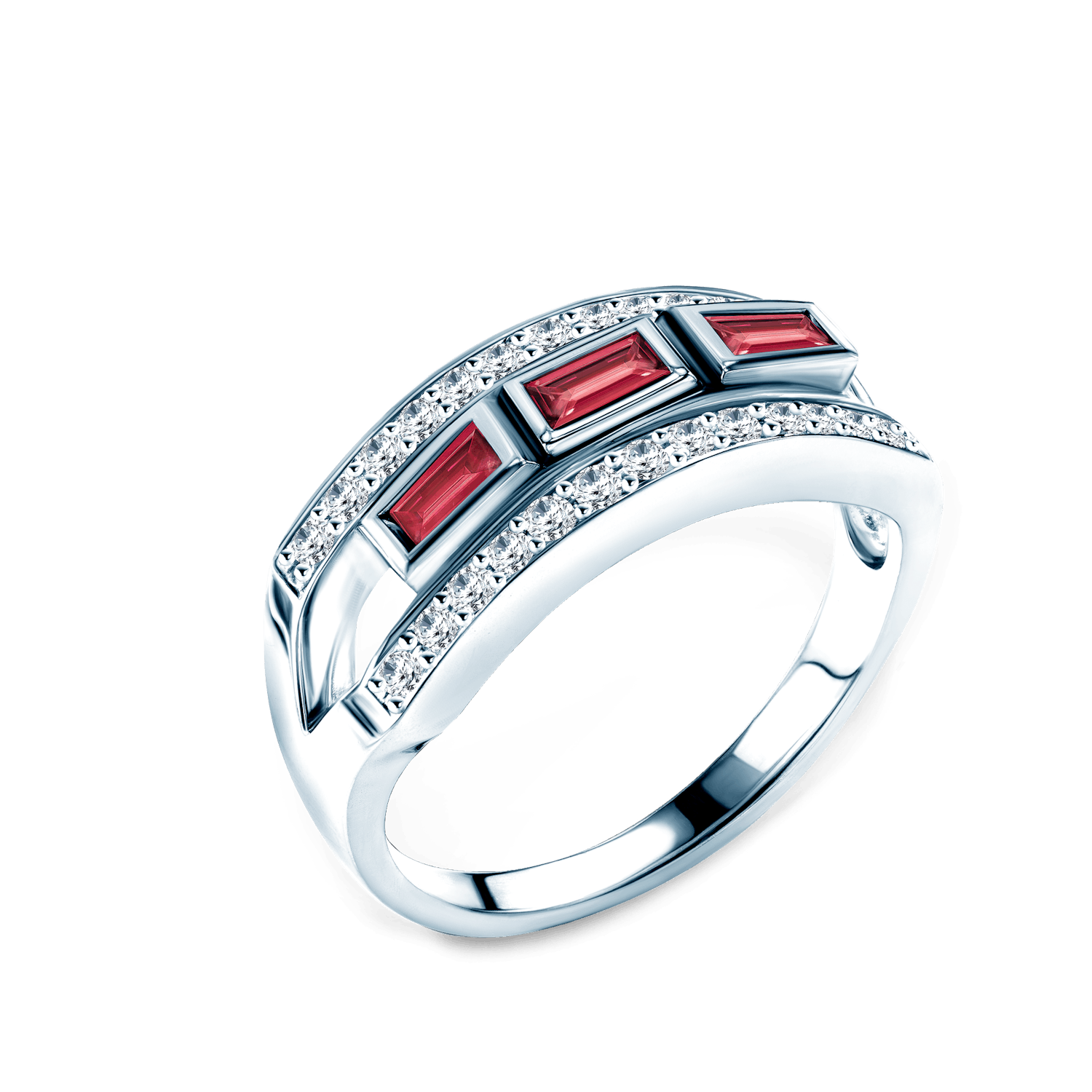 Pierścionek z 26 diamentami o łącznej masie 0,21 ct, szlifie brylantowym, czystości SI2/H oraz 3 rubinami o łącznej masie 0,39 ct, szlifie princessa wykonany z 14-karatowego białego złota (próba 585).