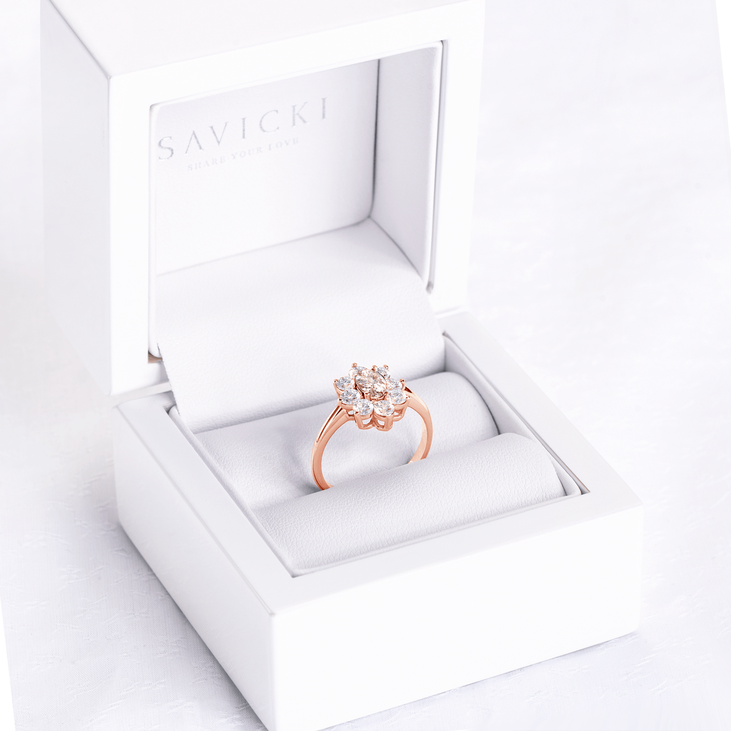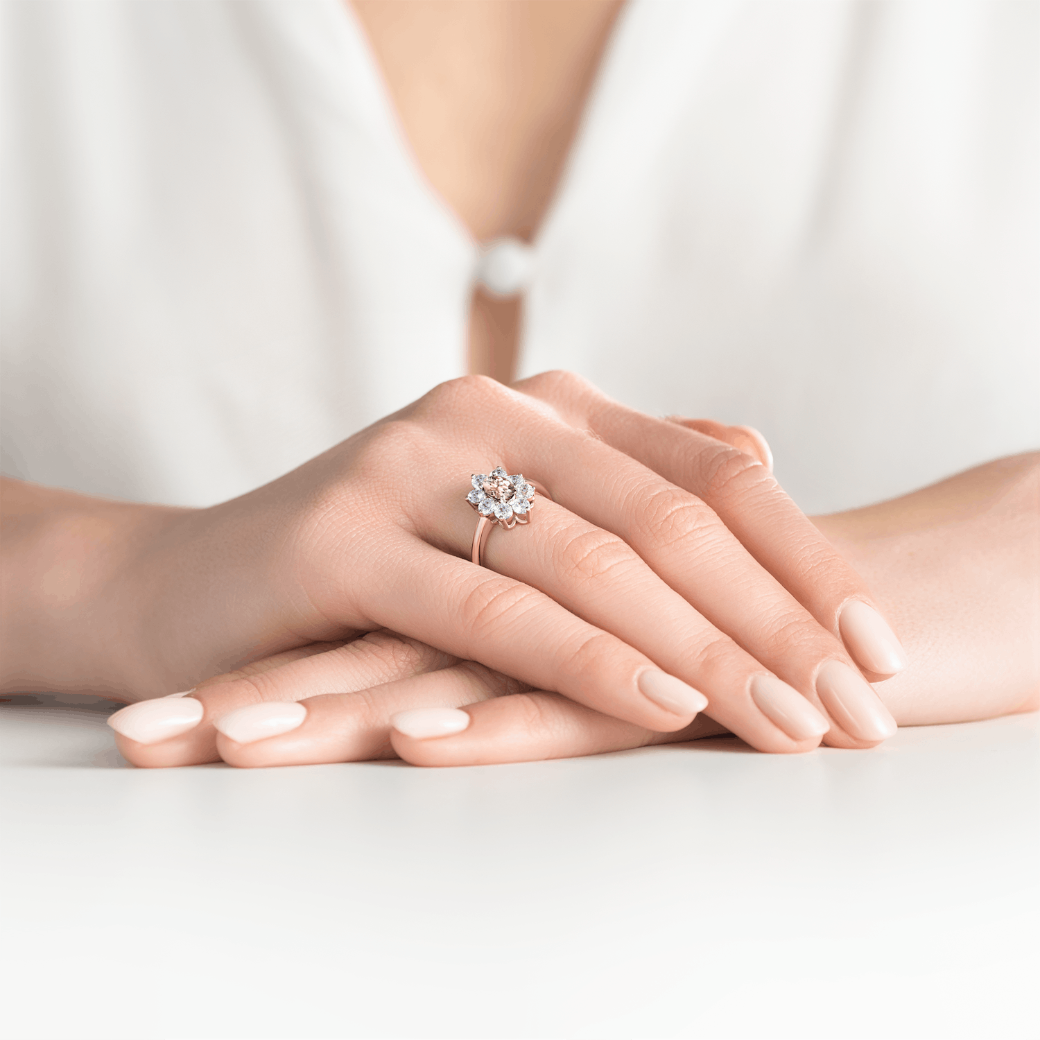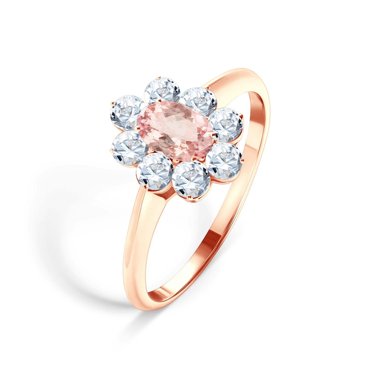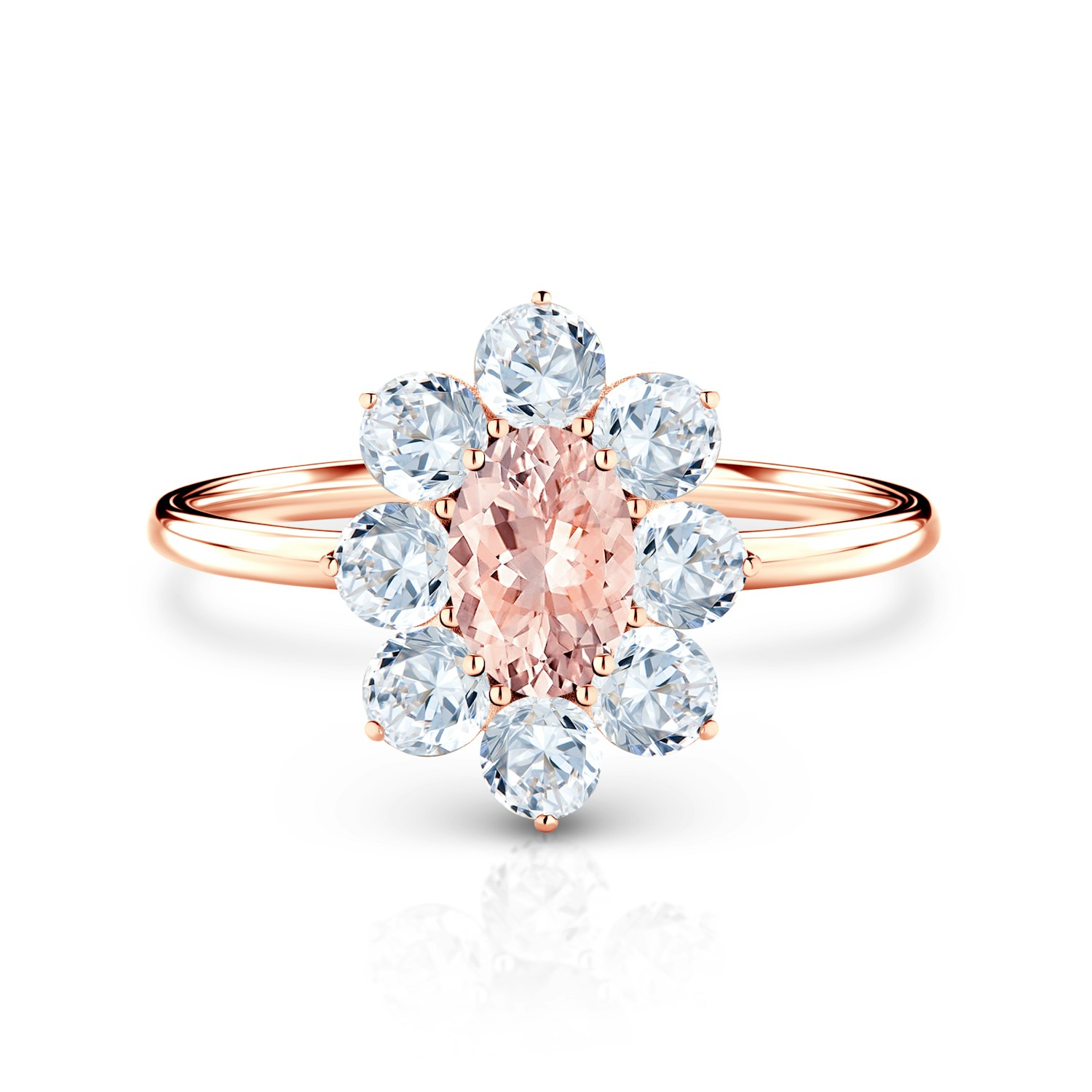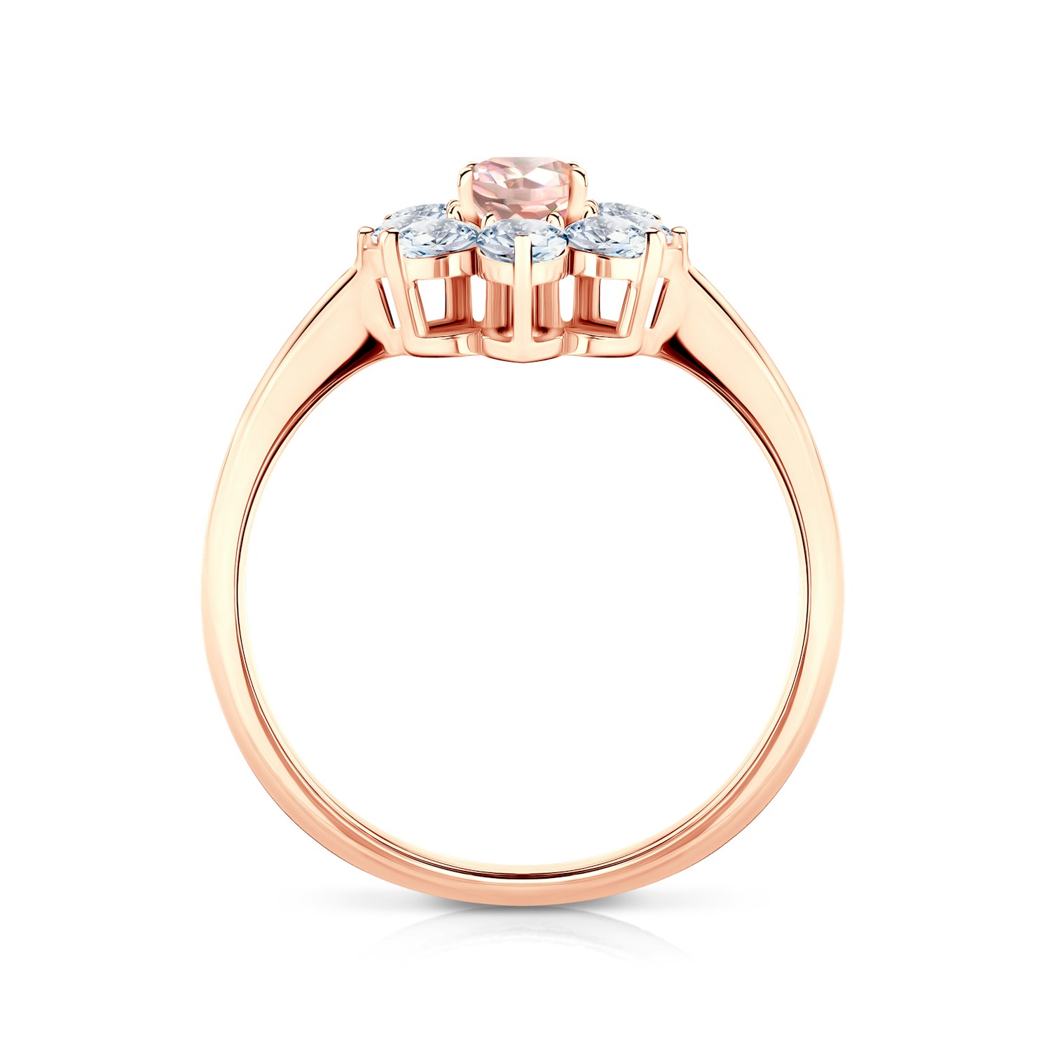 Pierścionek zaręczynowy z morganitem o szlifie owalnym, masie 0,40 ct oraz 8 białymi szafirami o łącznej masie 0,8 ct, wykonany został z 14-karatowego różowego złota próby 0,585.