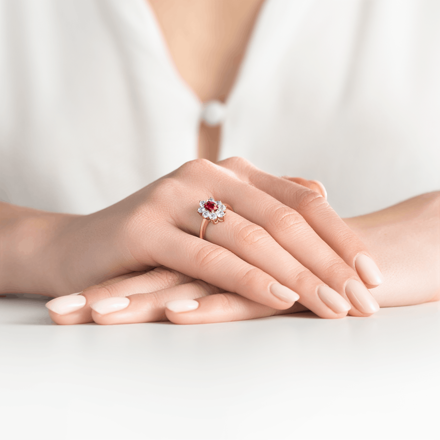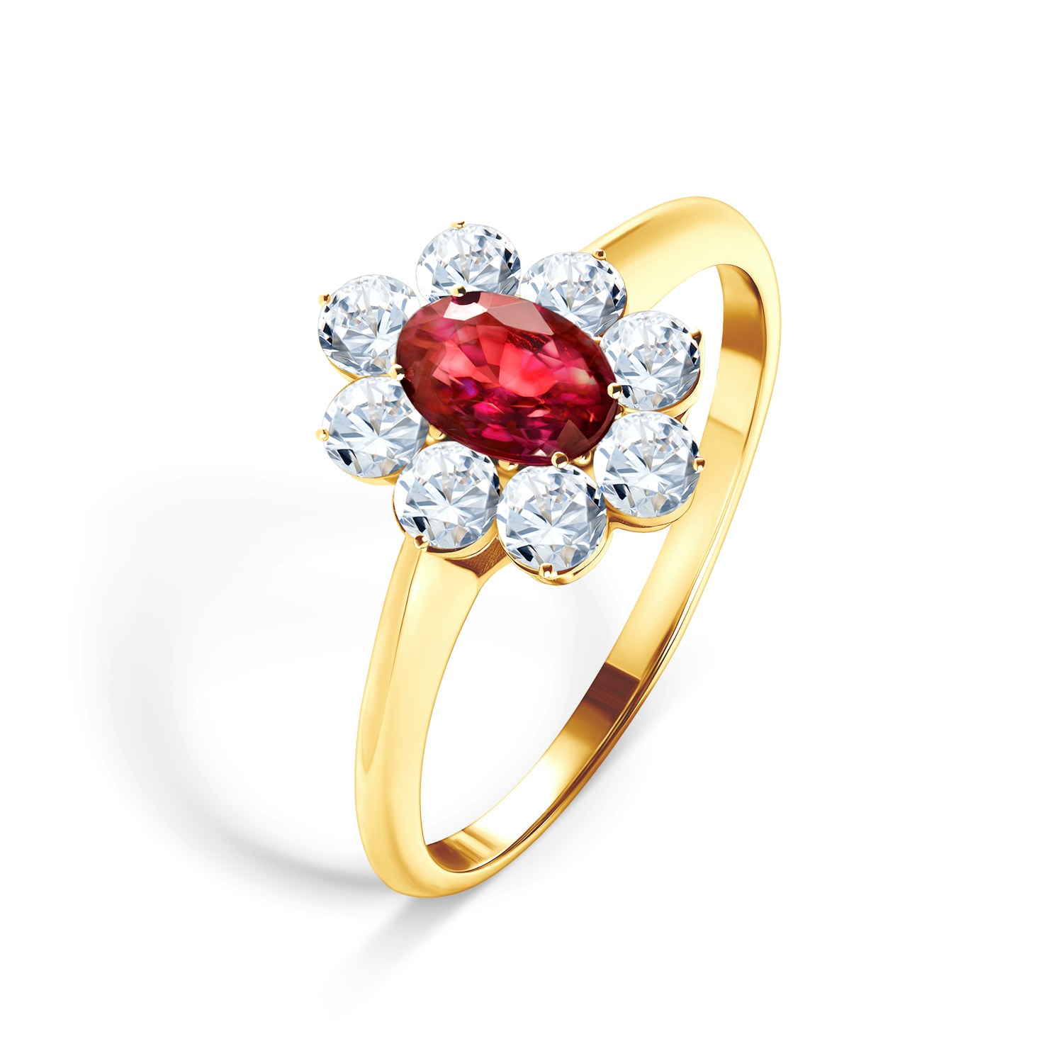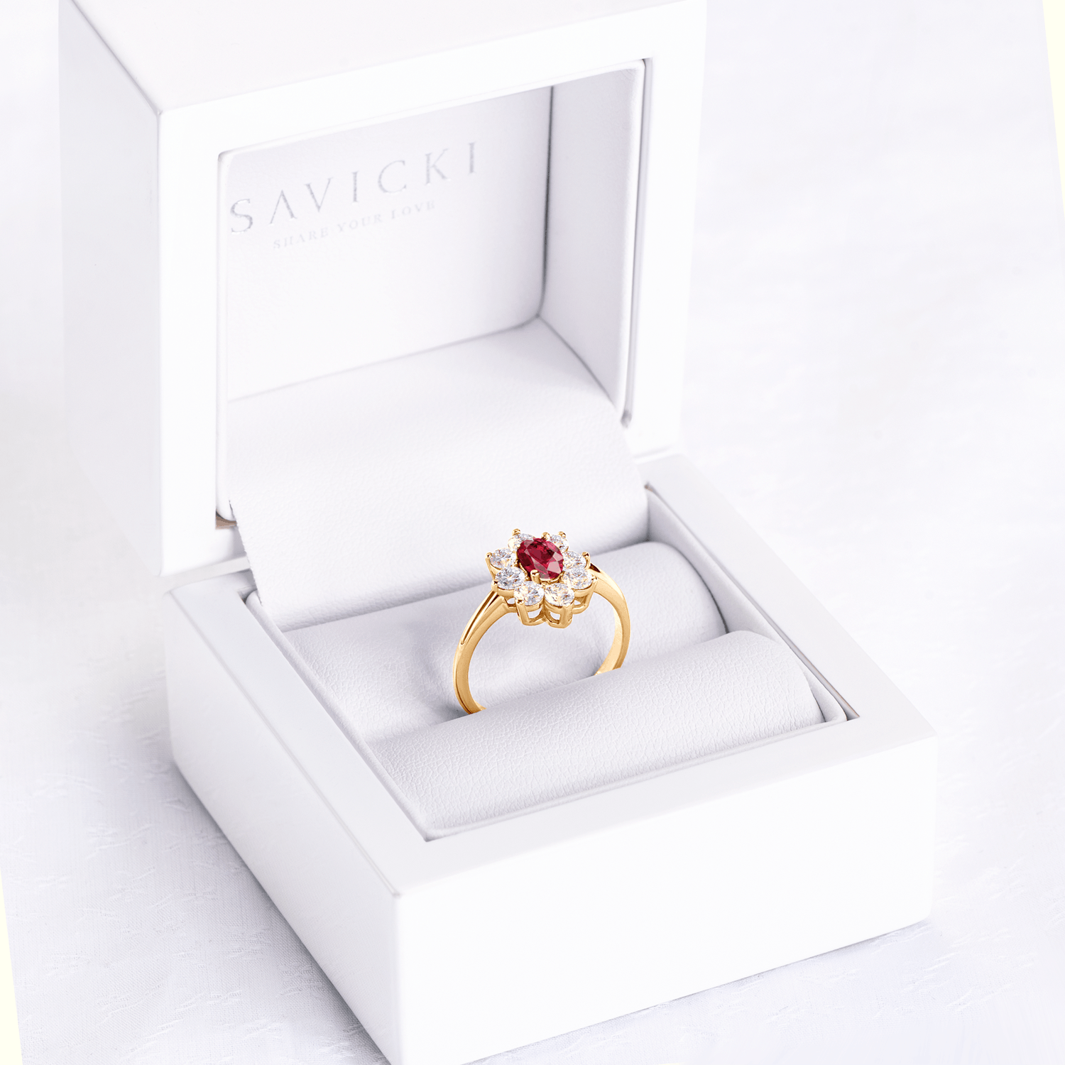 Pierścionek zaręczynowy z rubinem o szlifie owalnym, masie 0,50 ct oraz 8 białymi szafirami o łącznej masie 0,8 ct, wykonany został z 14-karatowego żółtego złota próby 0,585.