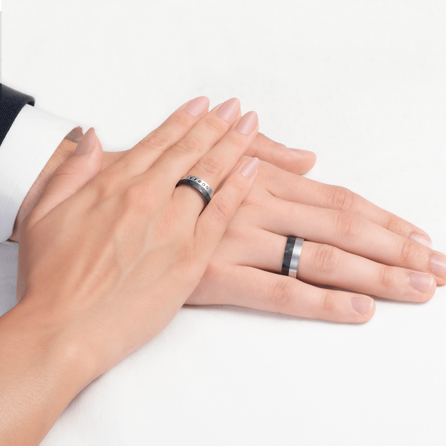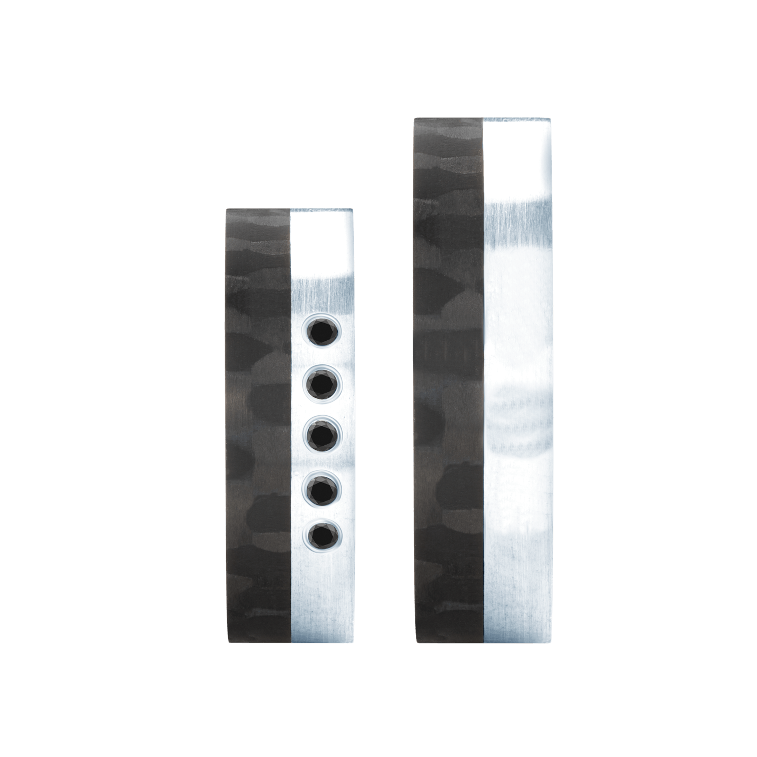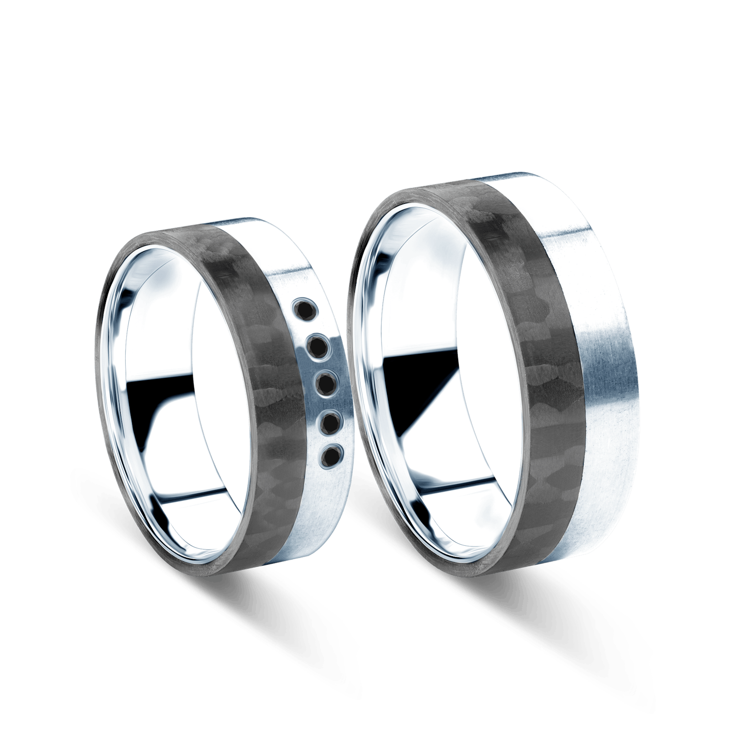 Obrączki ślubne płaskie wykonane z carbonu i srebra. Obrączka damska z czarnymi cyrkoniami lub czarnymi diamentami.