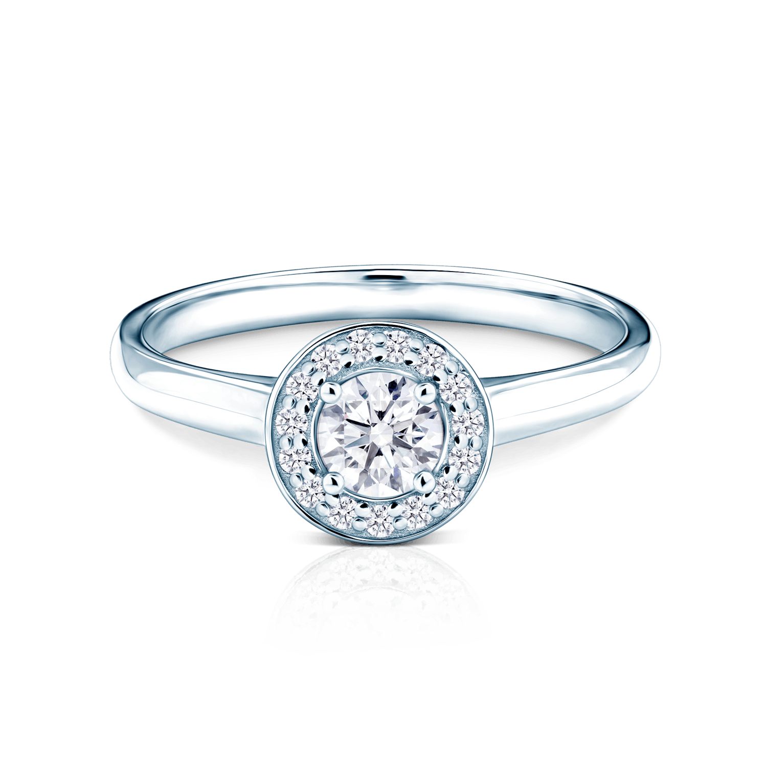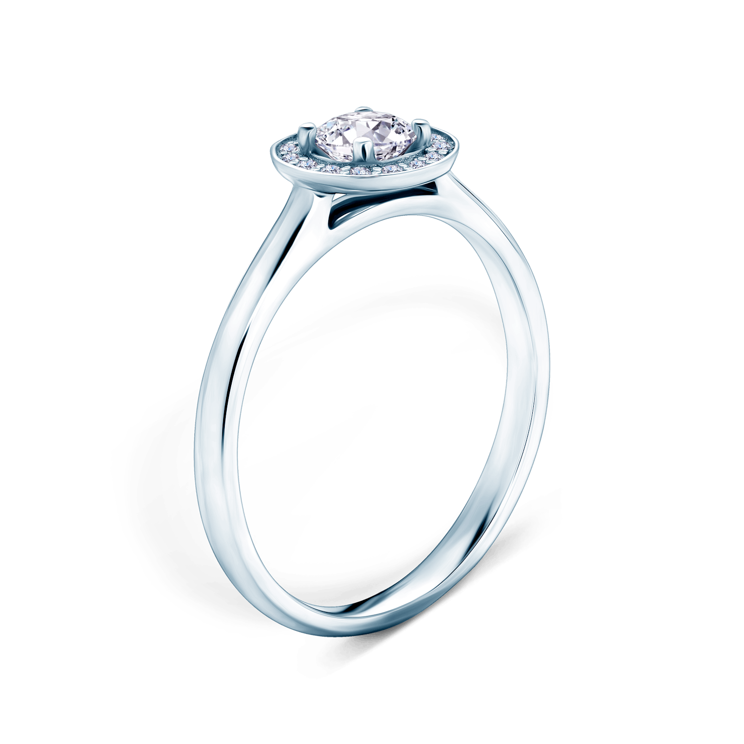 Pierścionek zaręczynowy z białym szafirem o masie 0,22 ct i szlifie brylantowym oraz 15 diamentami o szlifie brylantowym, wysokiej czystości SI2/H o łącznej masie 0,075 ct. Wykonany z 14-karatowego białego złota (próba 585).
