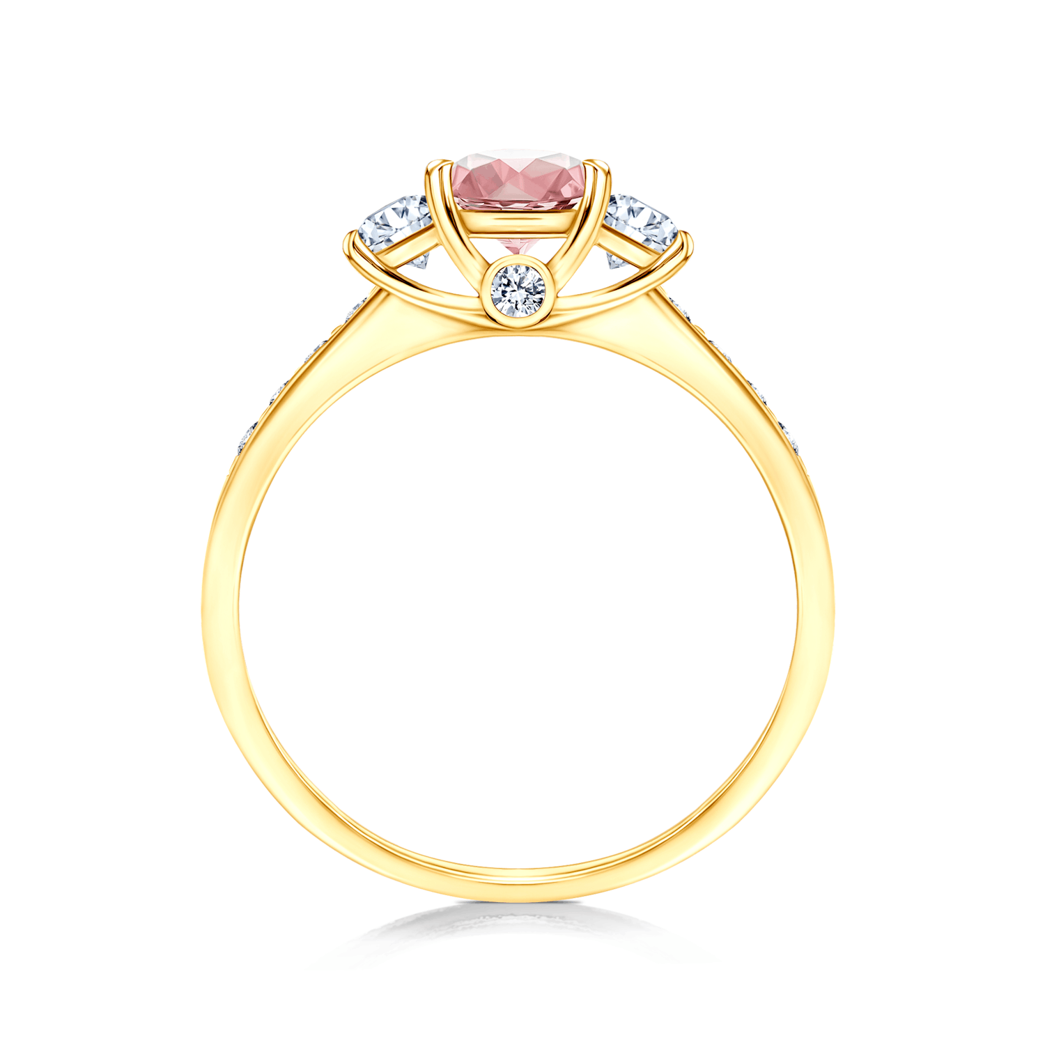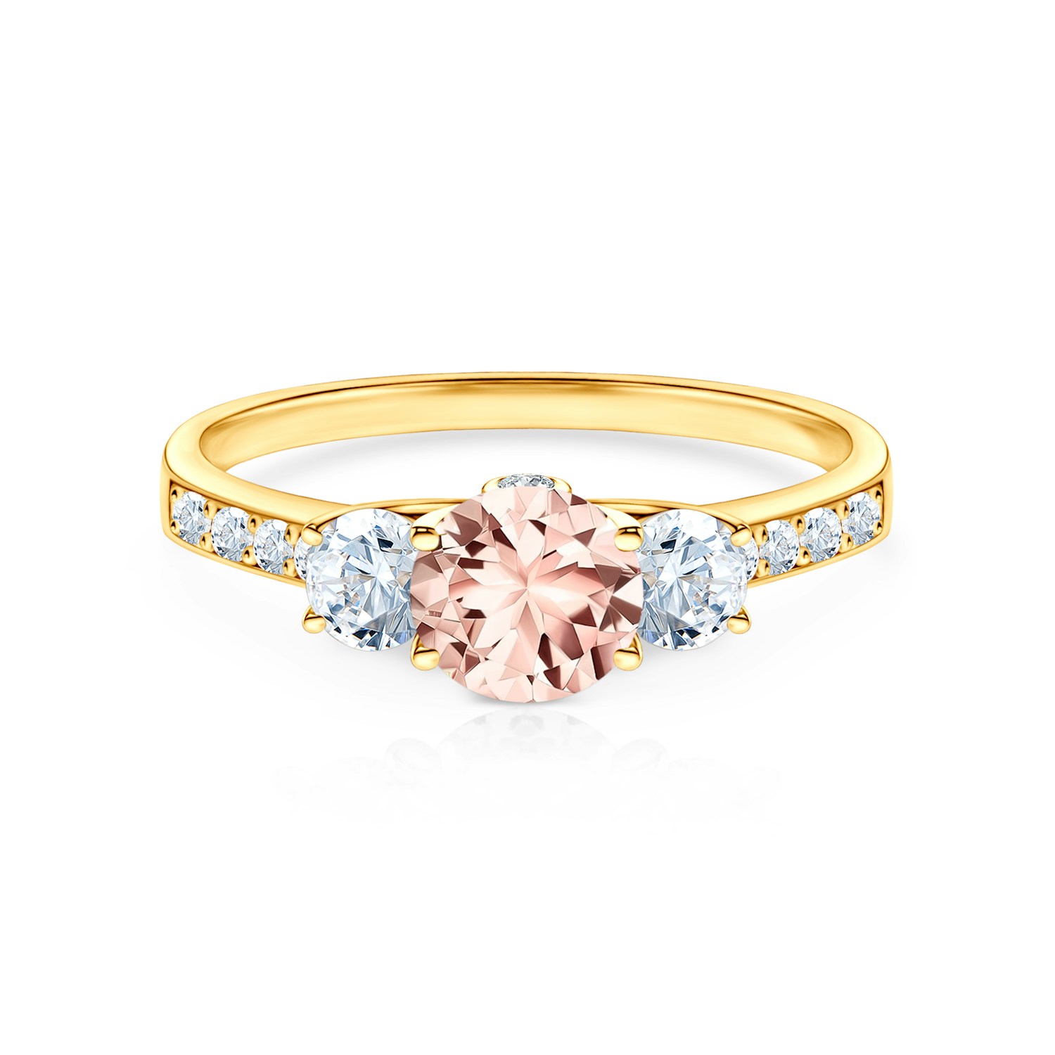 Pierścionek zaręczynowy z centralnie umieszczonym morganitem o masie 0,50 ct oraz dwoma białymi szafirami o łącznej masie 0,24 ct. Boczne diamenty posiadają łączną masę 0,15 ct o wysokiej czystości SI/H i szlifie brylantowym. Wykonany z 14-karatowego żółtego złota (próba 585).