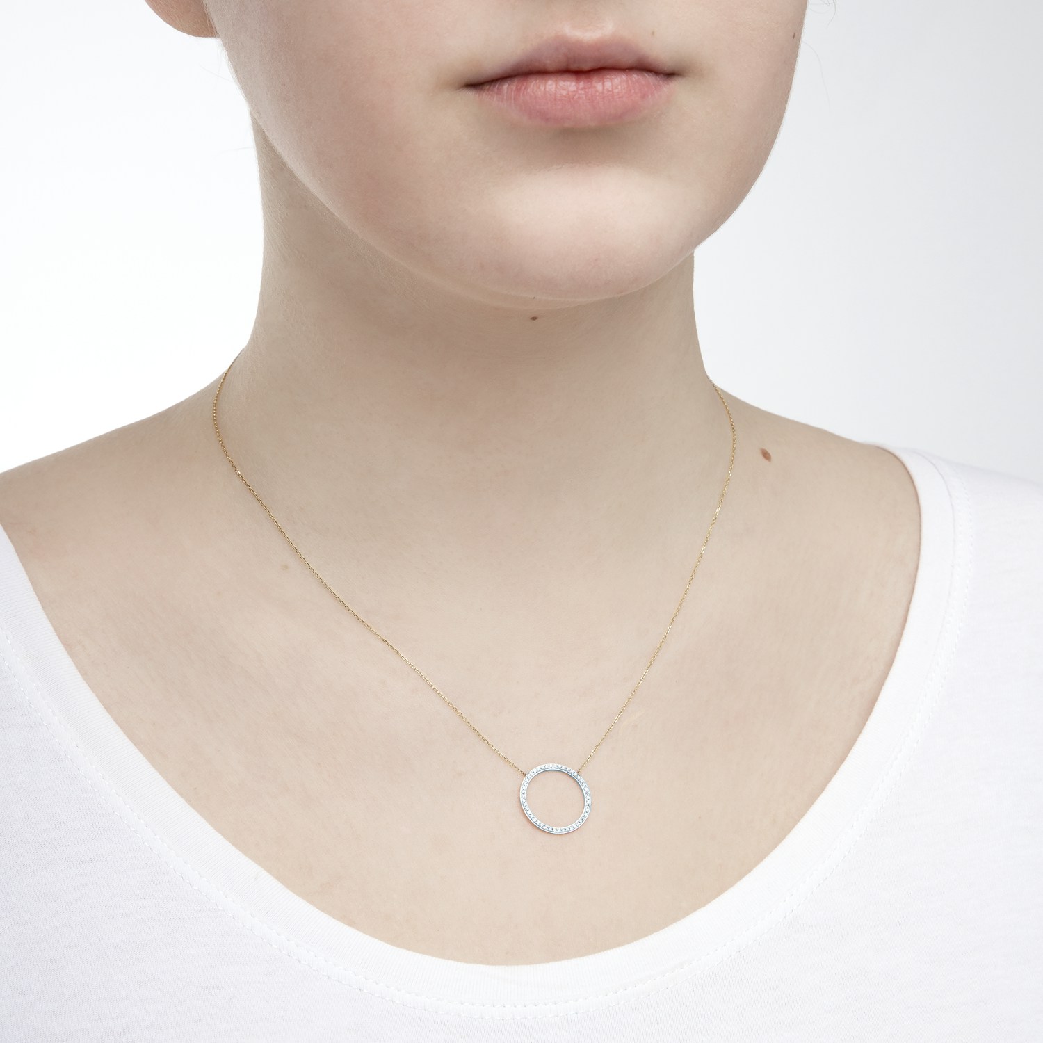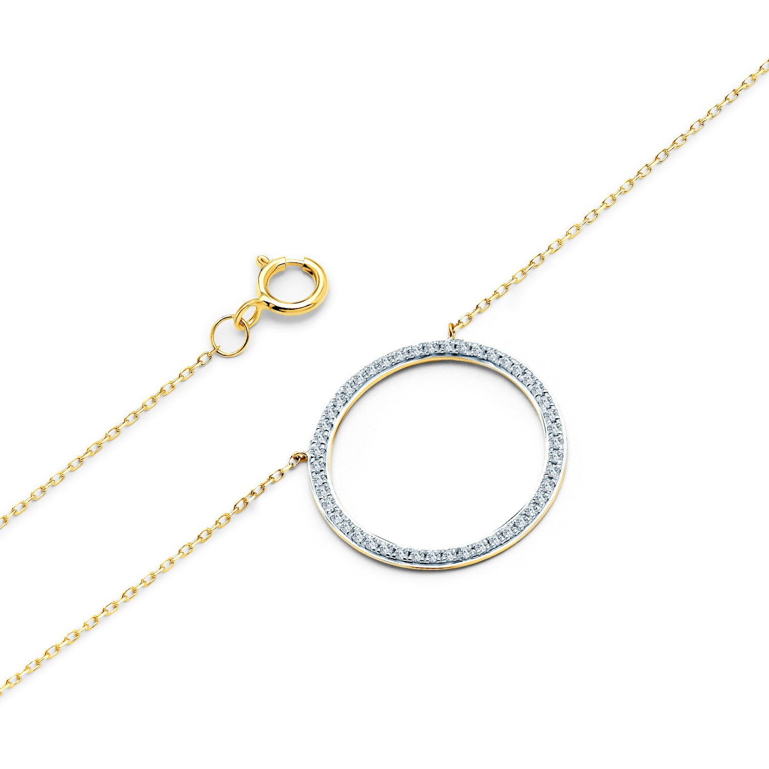 W naszyjniku zostało osadzonych 47 diamentów o szlifie brylantowym o łącznej masie 0,16 ct. Naszyjnik wykonany z połączenia białego i żółtego złota (próba 585).