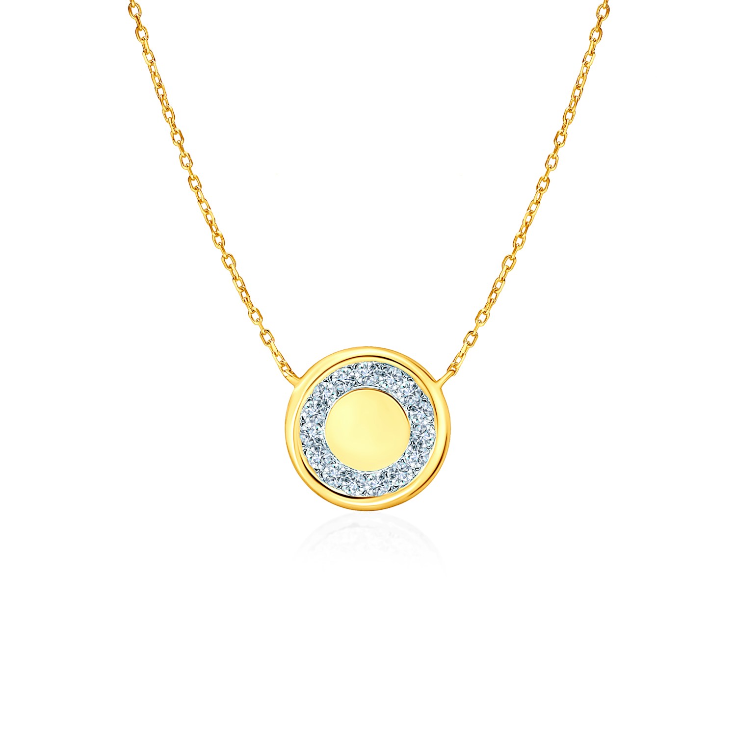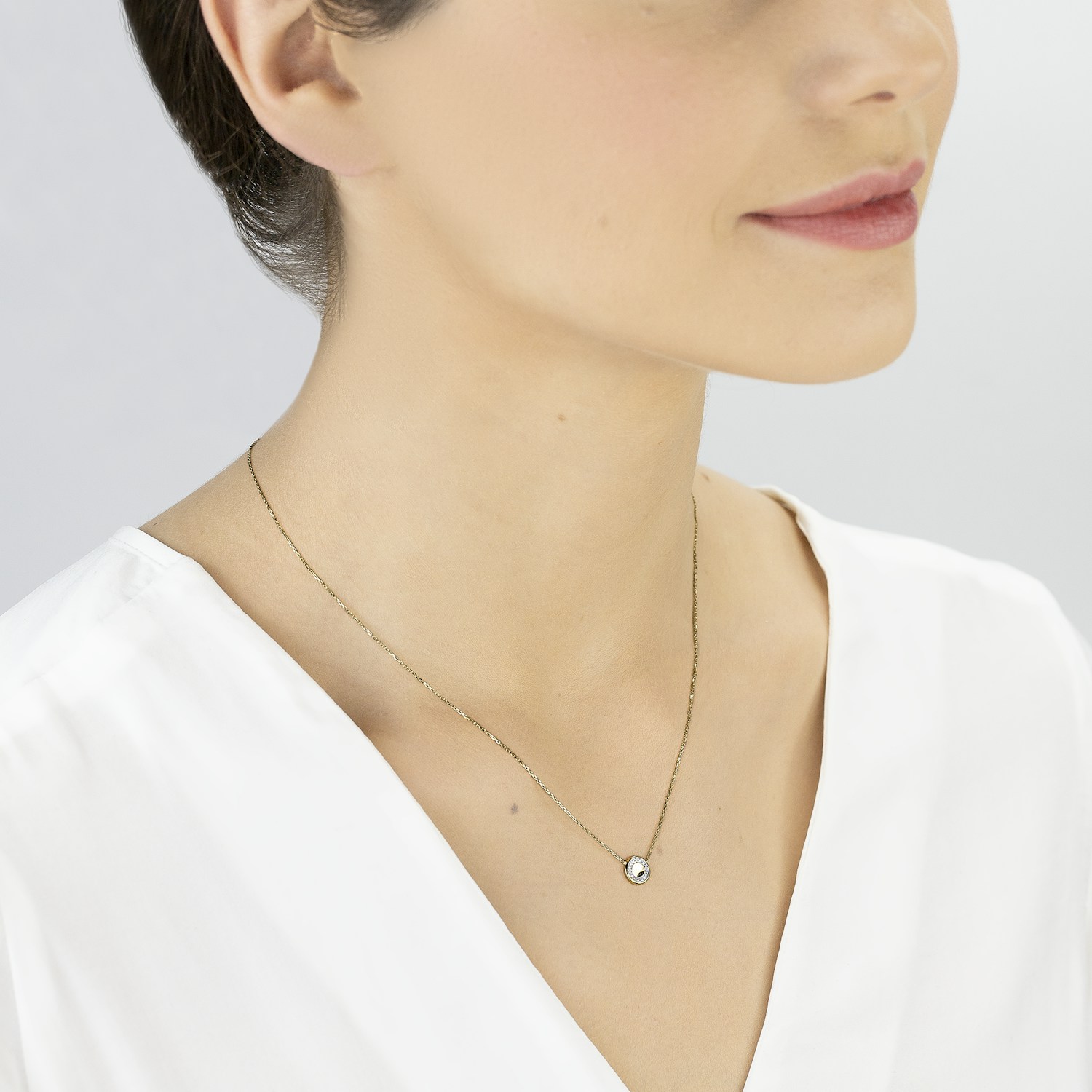W naszyjniku zostało osadzonych 5 diamentów o łącznej masie 0,01 ct ze szlifem brylantowym. Naszyjnik wykonany z połączenia białego i żółtego złota(próba 585).