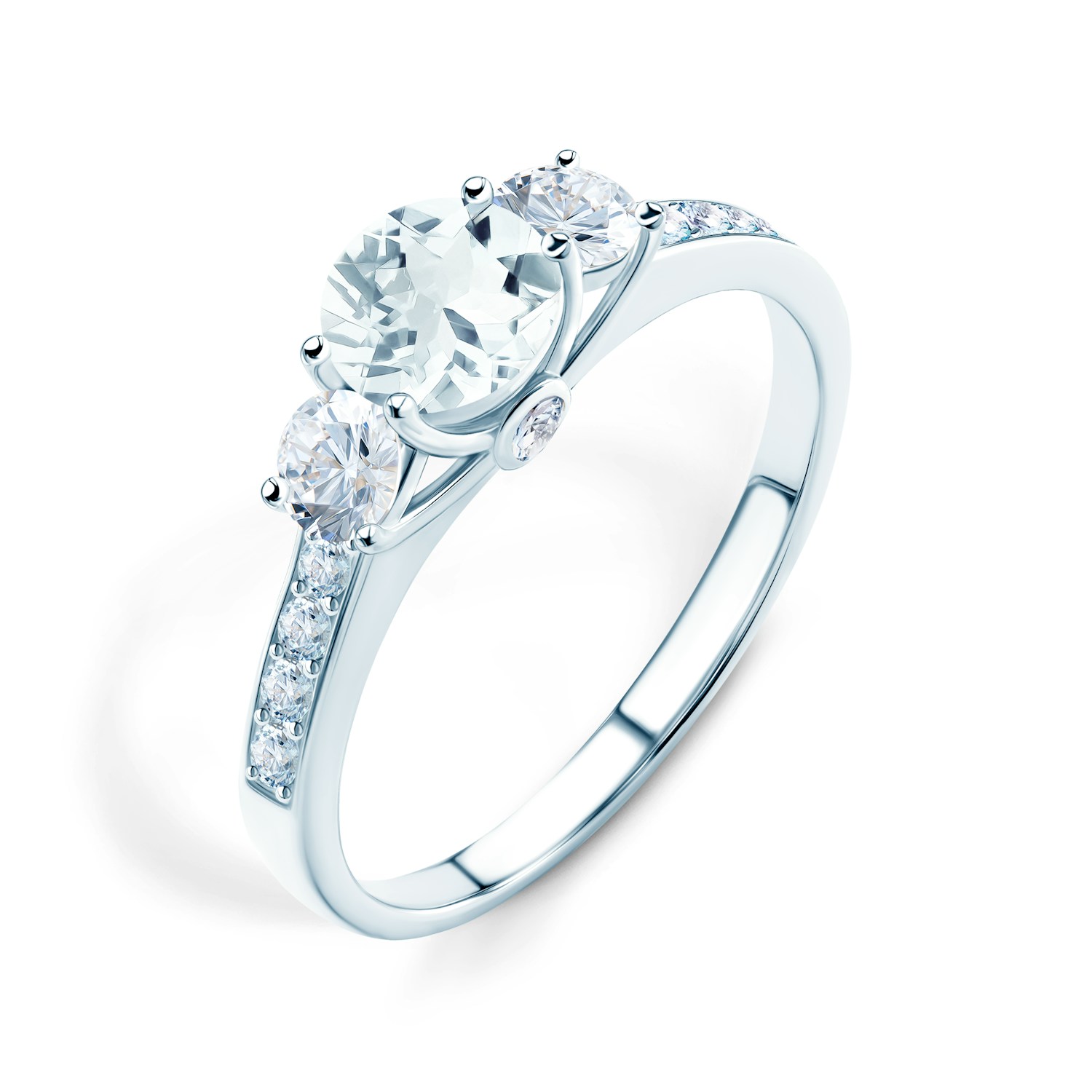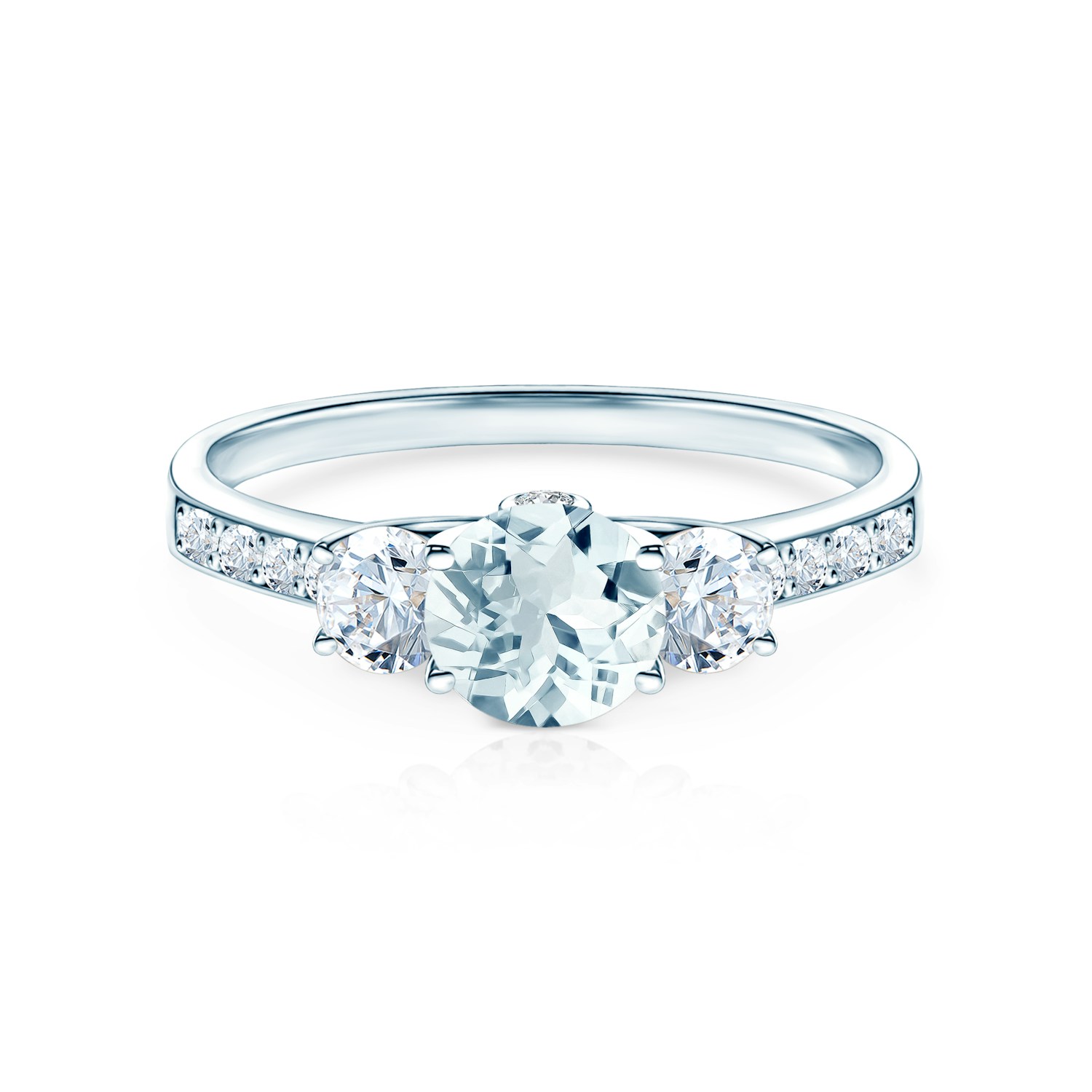 Pierścionek zaręczynowy z centralnie umieszczonym akwamarynem o masie 0,50 ct oraz dwoma białymi szafirami o łącznej masie 0,24 ct. Boczne diamenty posiadają łączną masę 0,15 ct o wysokiej czystości SI/H i szlifie brylantowym. Wykonany z 14-karatowego białego złota (próba 585).