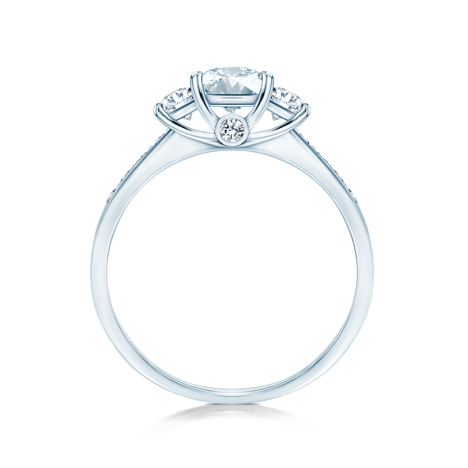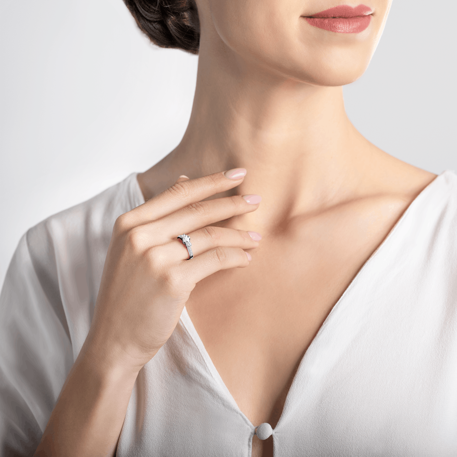 Specjalnie wyprofilowana obrączka idealnie wpasowuje się w pierścionek zaręczynowy, tworząc jedyną taką kompozycję biżuterii.