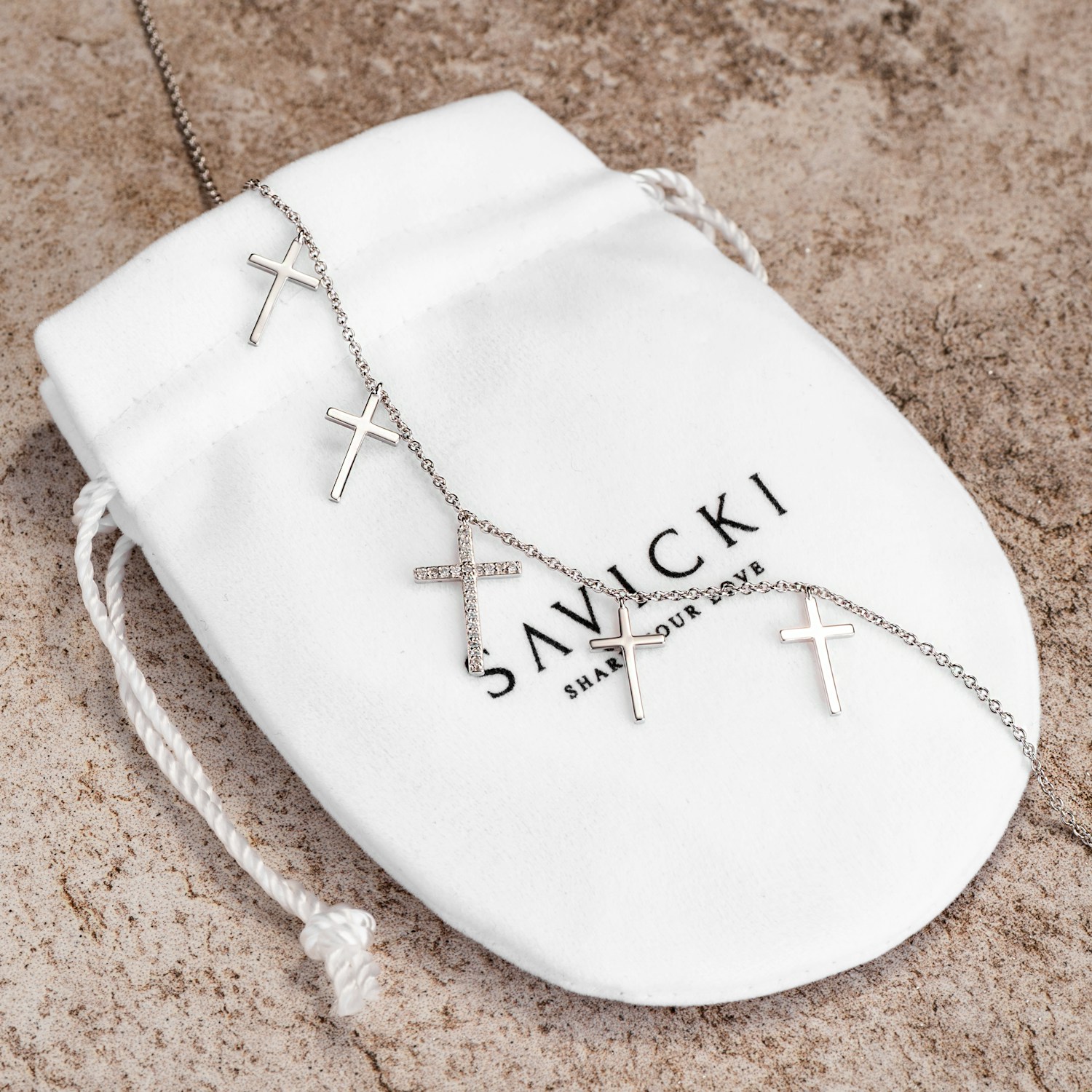 Naszyjnik krzyżyki Savicki wykonany ze srebra (próba 925). W naszyjniku osadzone zostały cyrkonie.