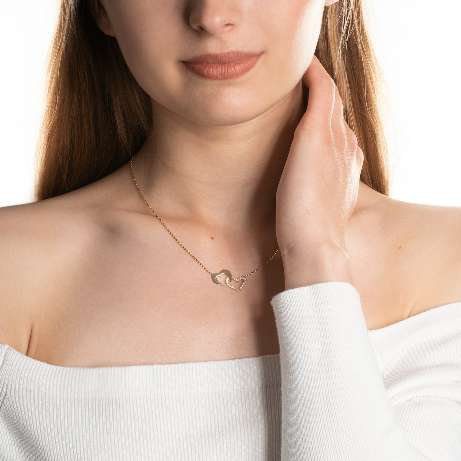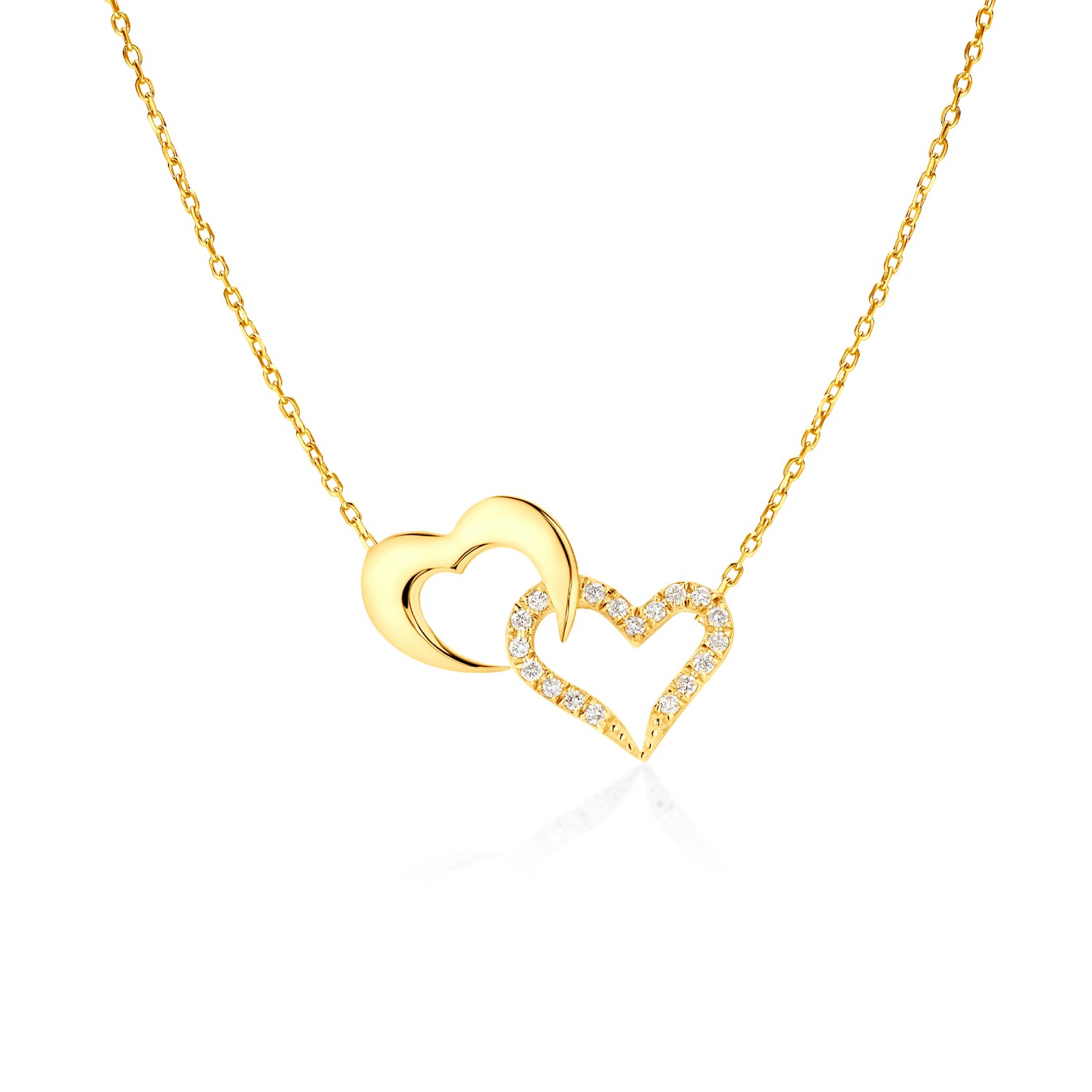 Naszyjnik serce wykonany z żółtego złota (próba 585). W naszyjniku zostało osadzonych 18 diamentów o łącznej masie 0,13 ct.