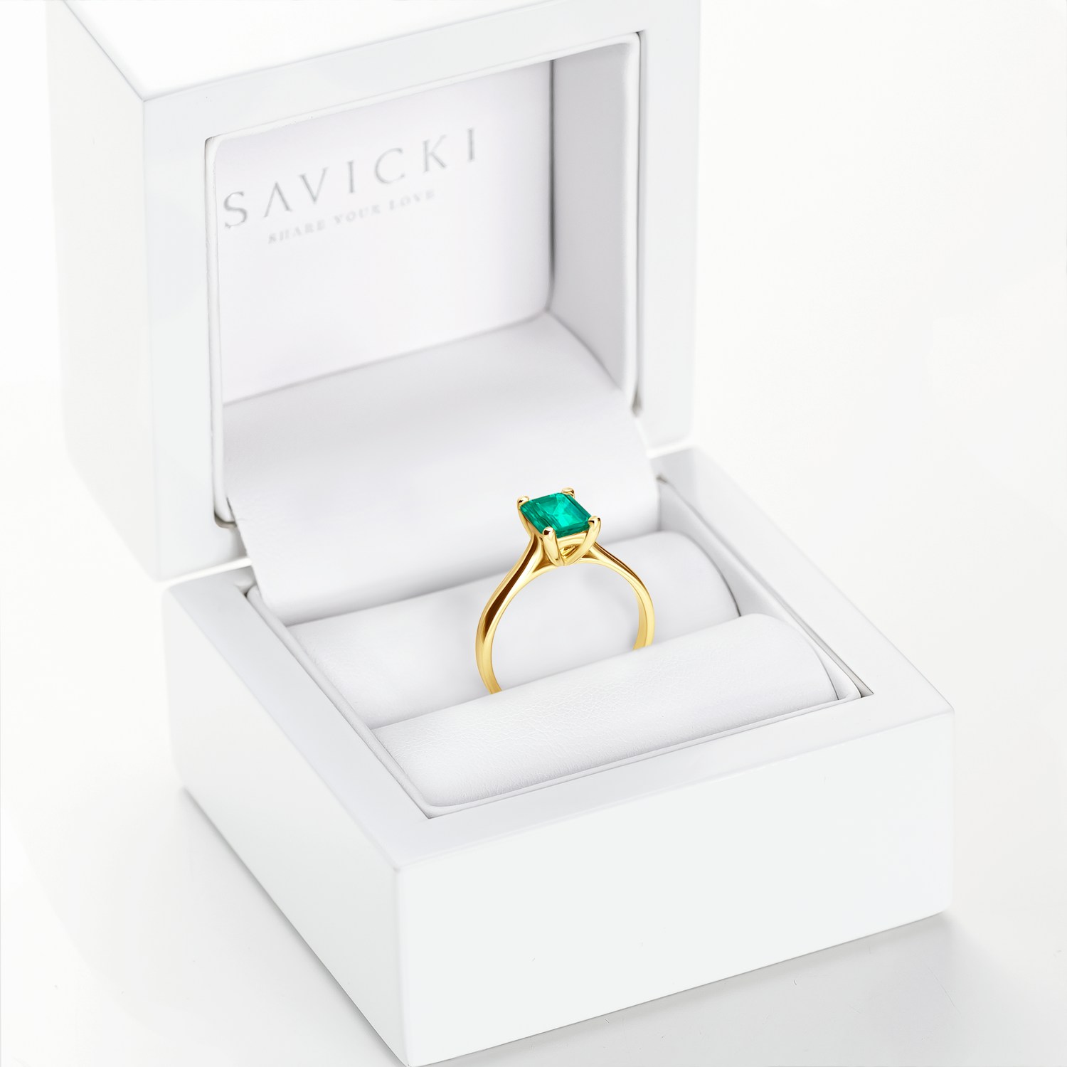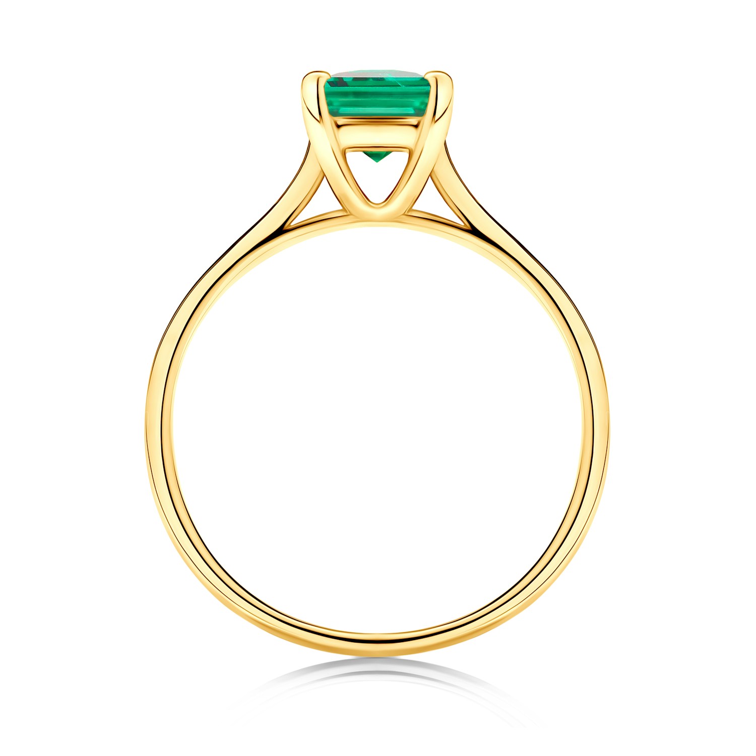 Pierścionek zaręczynowy ze szmaragdem 7x5mm o szlifie szmaragdowym, wykonany z 14-karatowego żółtego złota (próba 0,585).